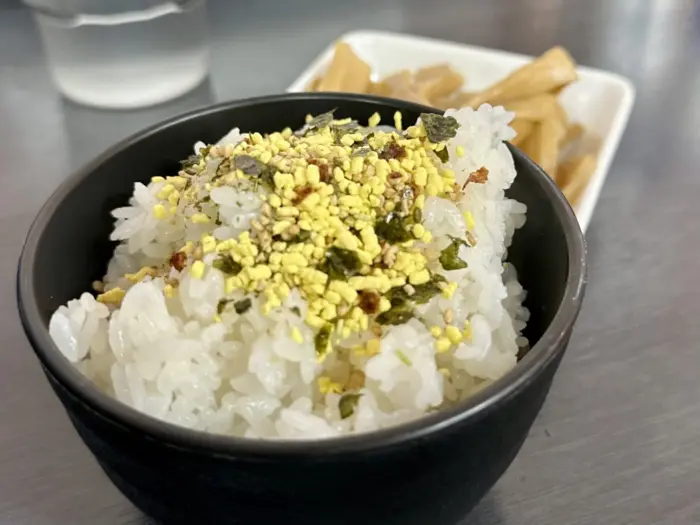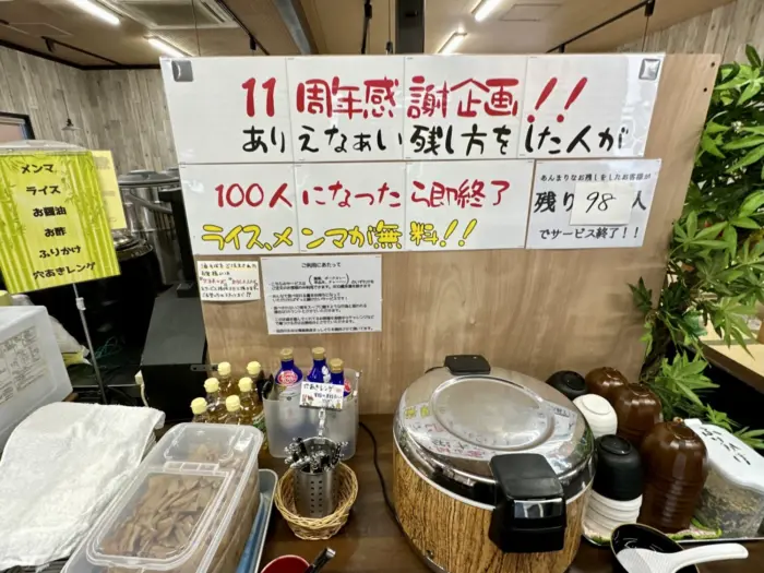 なんと期間中はライスもメンマも食べ放題、もちろん従来の煮干し出汁スープも揃って飲み放題っていう。