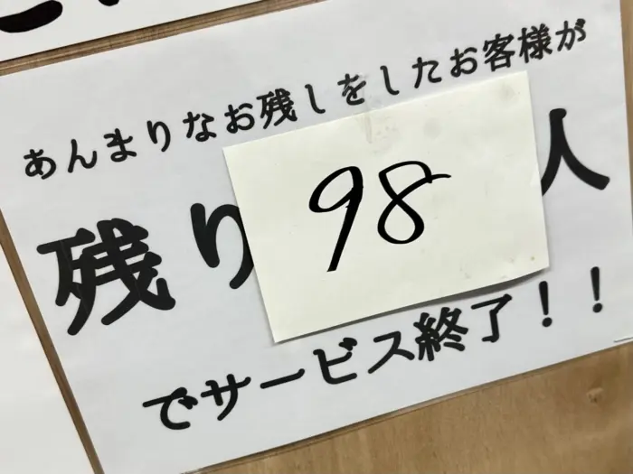 その無限ライス&メンマをホイドたがって山盛りにした挙句に残すっていう、マシマシ系のヤマモリ店なら口汚く罵られた末に罰金徴収レベルの大罪人が100人なった時点で終了、ってシステム。
