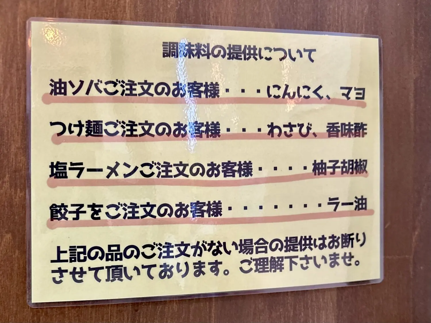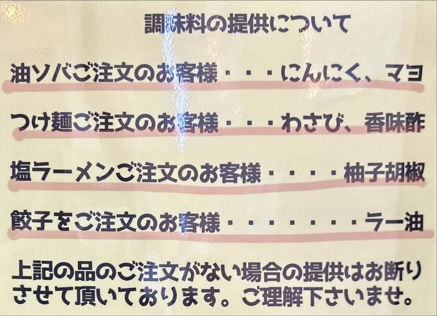 頼んだメニューに応じてそれぞれの専用調味料が出てくる仕組み、煮干しラーメン頼んだけどマヨ出してー、は通らないのであしからず?ε-(´∀`; )
