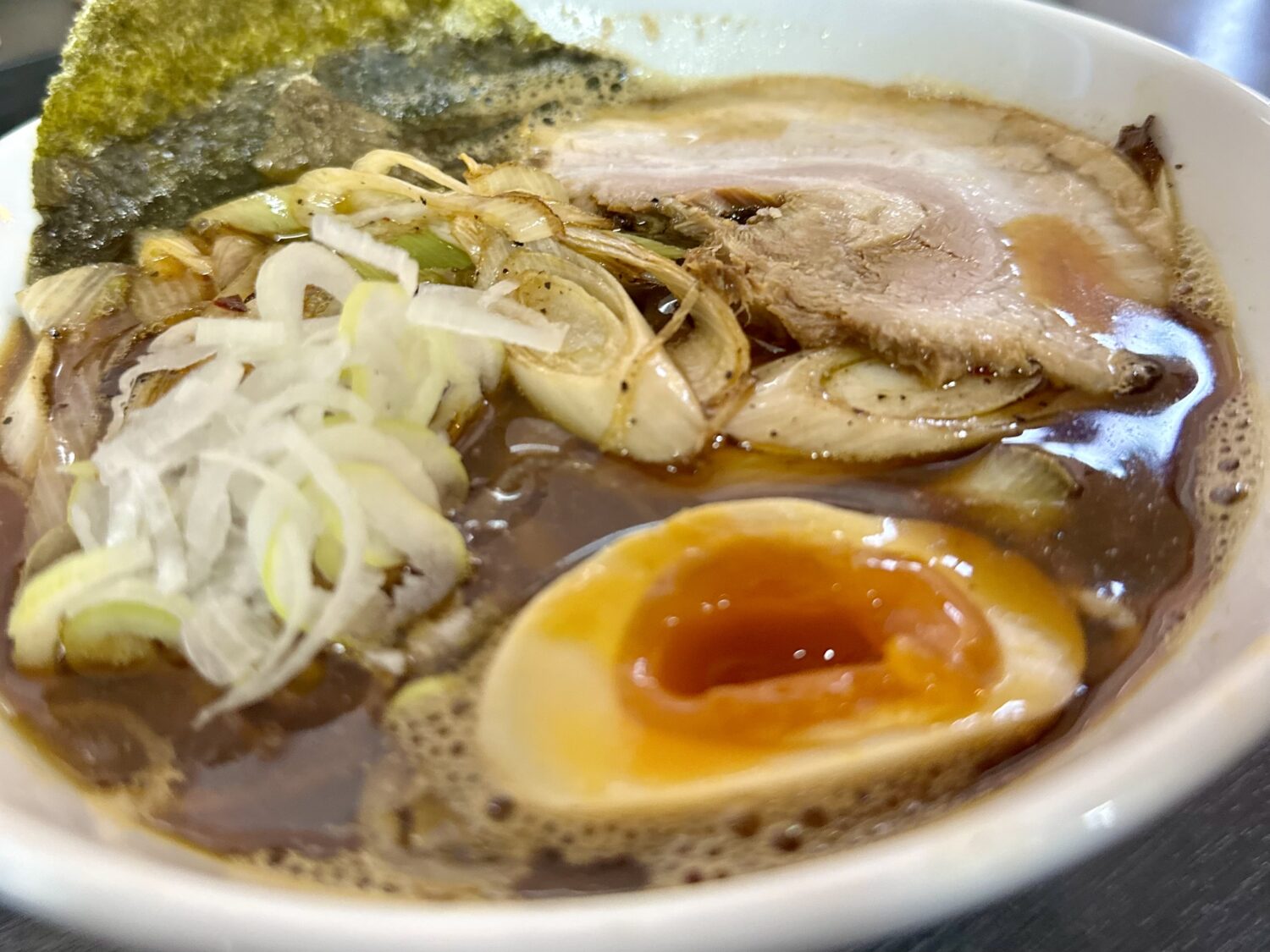 乗せ具はホロトロチャーシューに味玉ハーフ、魚粉乗せの海苔1枚に輪ネギとラー油ネギでなかなか豪華