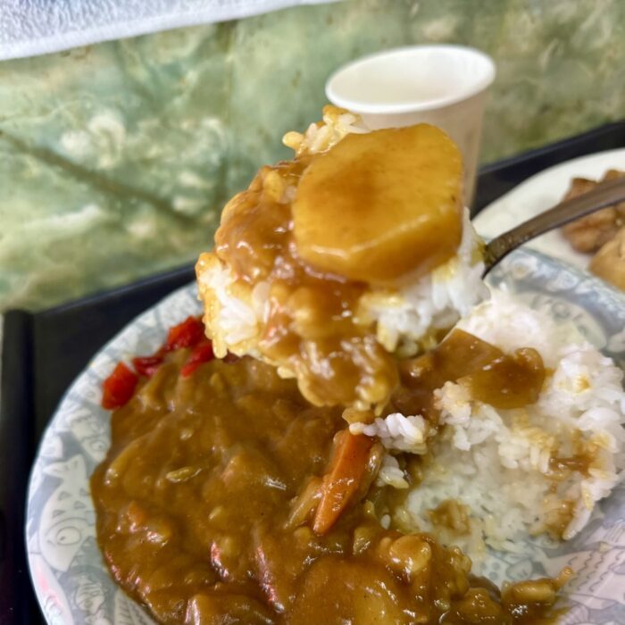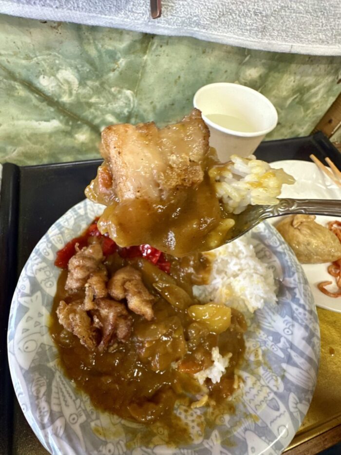 モッタラモッタのカレールゥ、見た目以上にゴイッと盛られたライス、控えめながら芯の強さが見えるシーフード感、そしてカッチャの良き雰囲気。