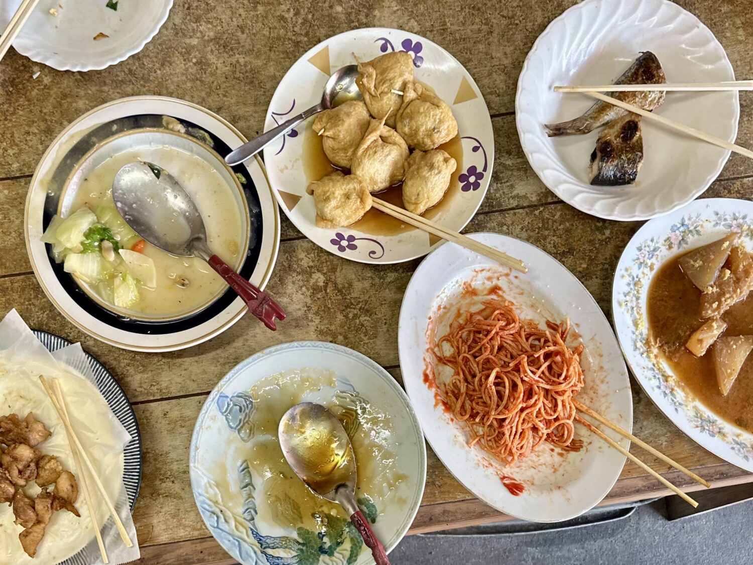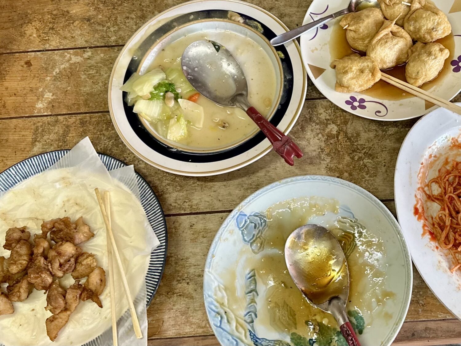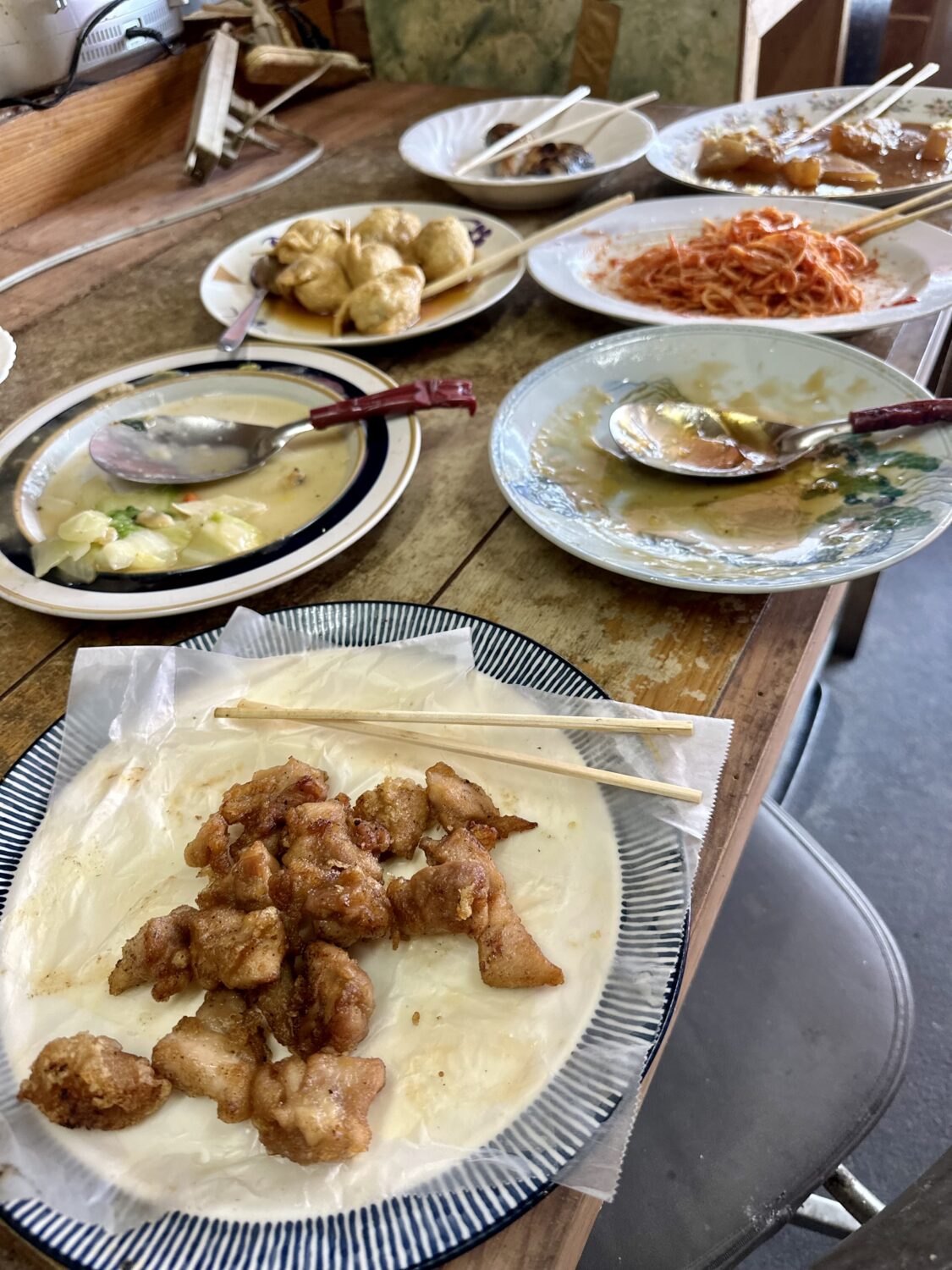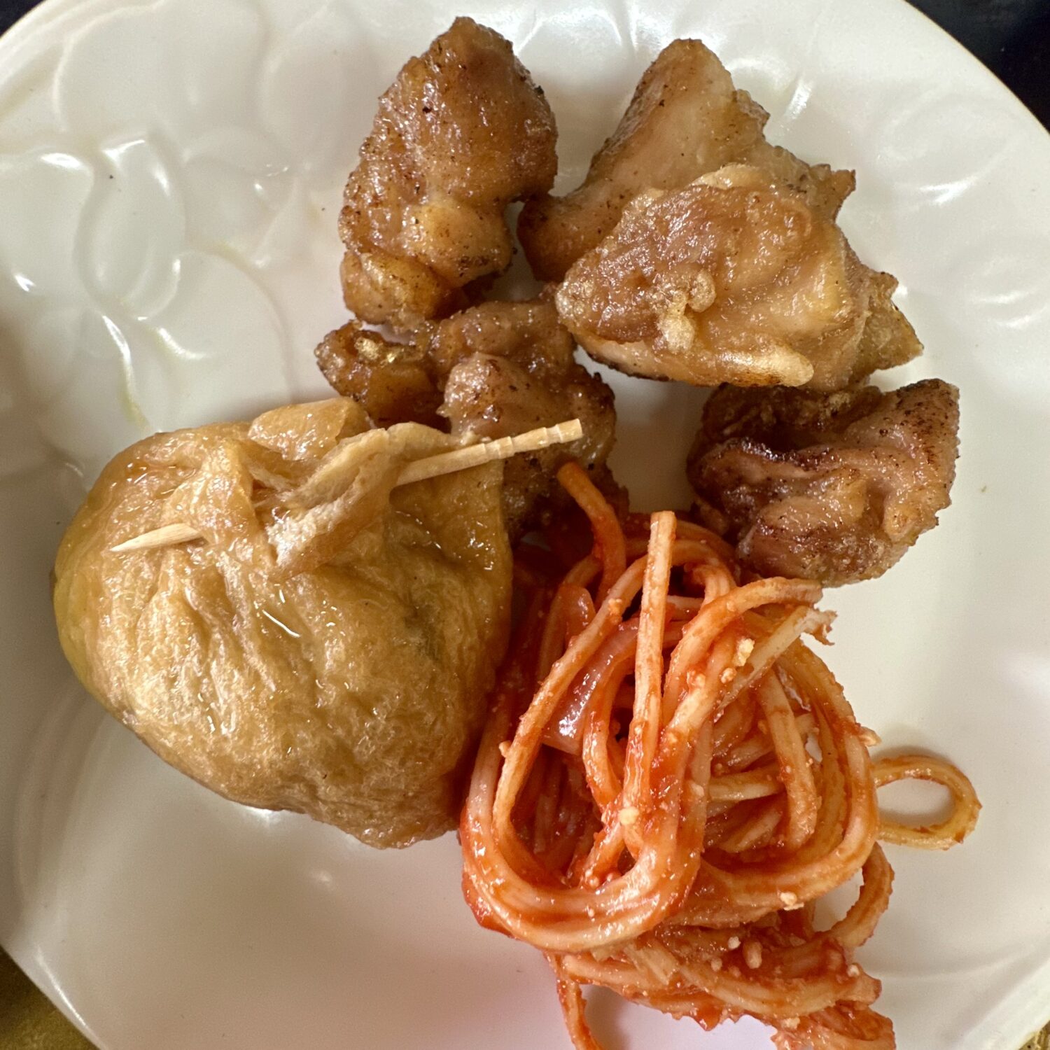 テーブルに並ぶ惣菜はもはや量り売りすらしない、カッチャの完全目視による精算制で、唐揚げ含む3品それなりに盛って250円っていう鬼安さ。
