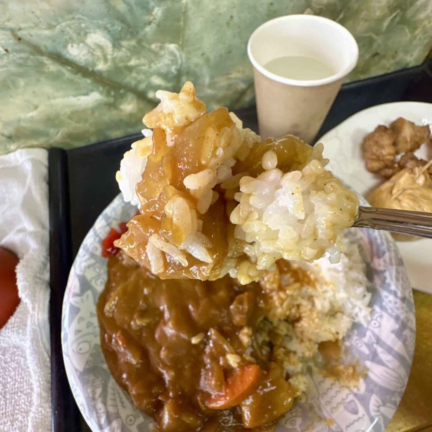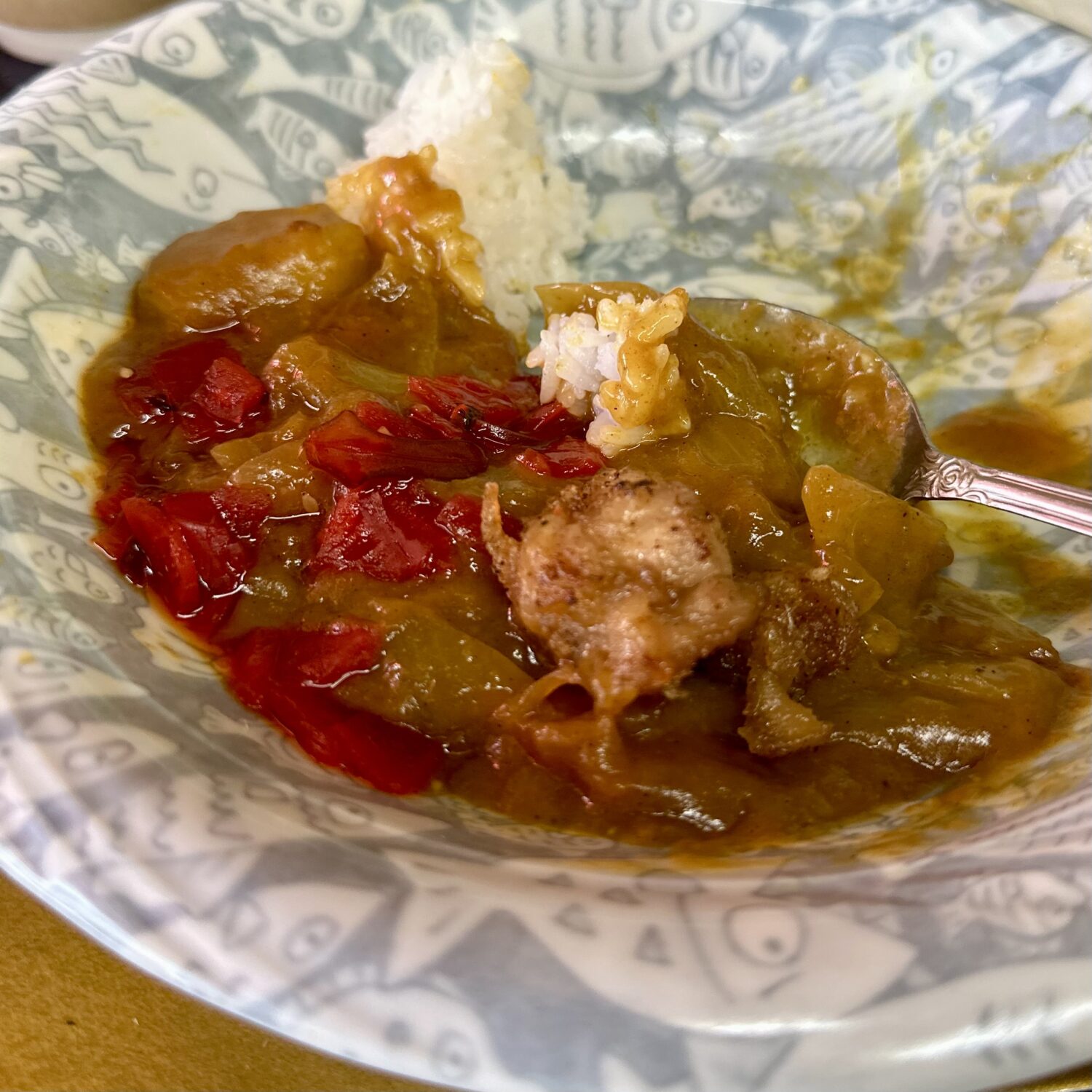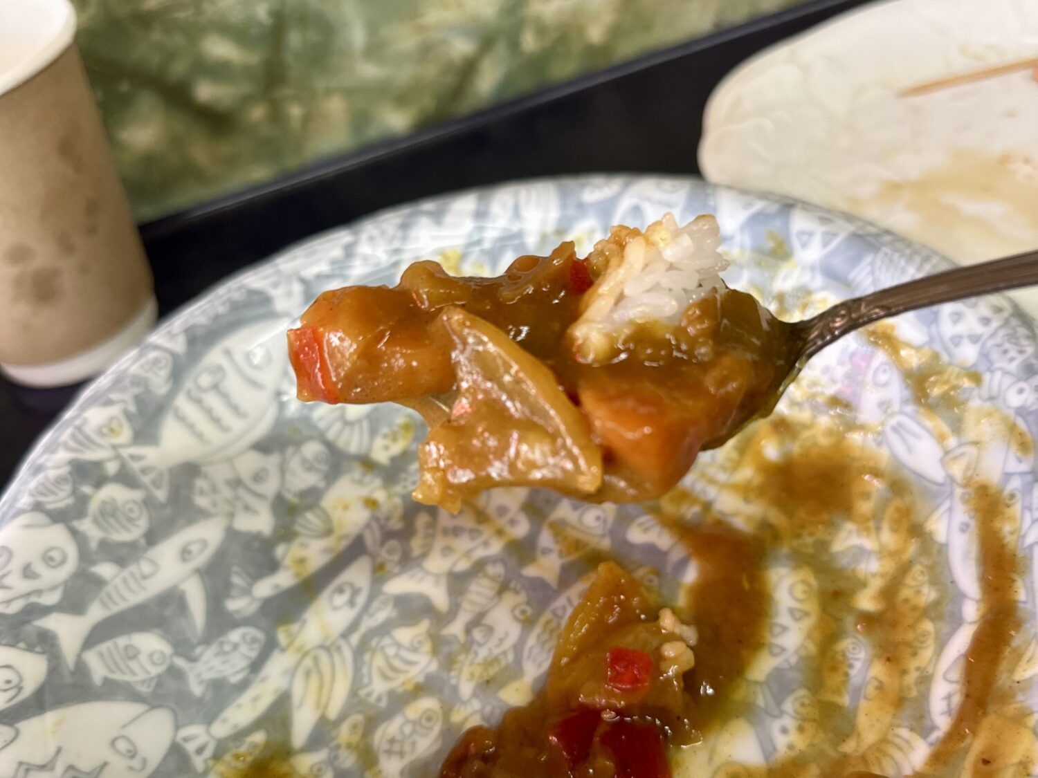 モッタラモッタのカレールゥ、見た目以上にゴイッと盛られたライス、控えめながら芯の強さが見えるシーフード感、そしてカッチャの良き雰囲気。