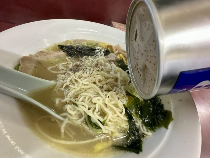 そんな幸畑ラーショの気になる調味料、メインにデッカ缶のブラックペッパーを置いてある他、カウンターの1箇所にラー油とか一味唐辛子とかもあり