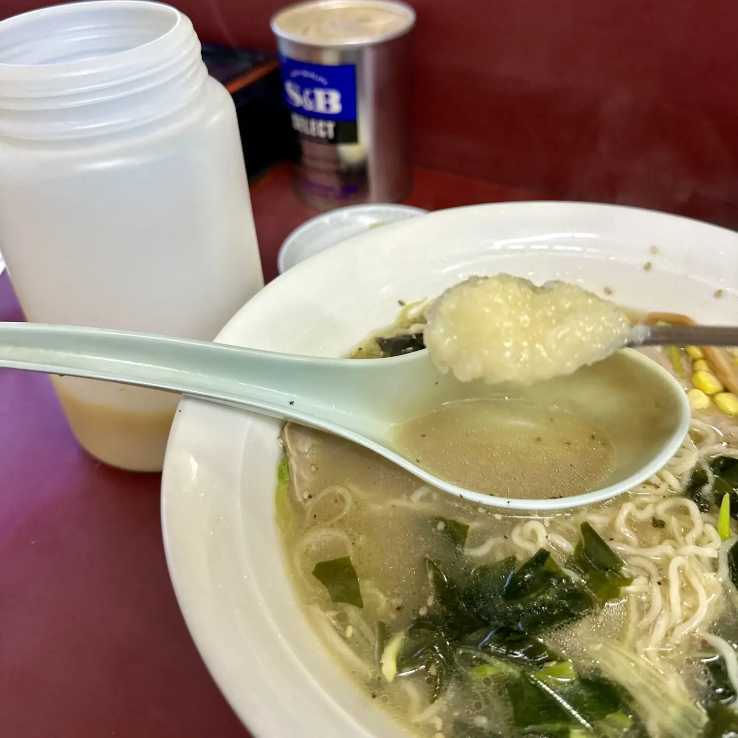 そんな幸畑ラーショの気になる調味料、メインにデッカ缶のブラックペッパーを置いてある他、カウンターの1箇所にラー油とか一味唐辛子とかもあり