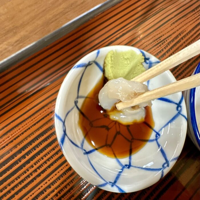 箸でつまみ持ち上げたら小皿のワサビ醤油にちょんちょん、って、、ちょんちょんって、、