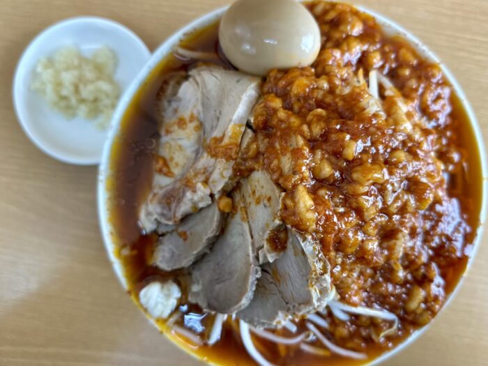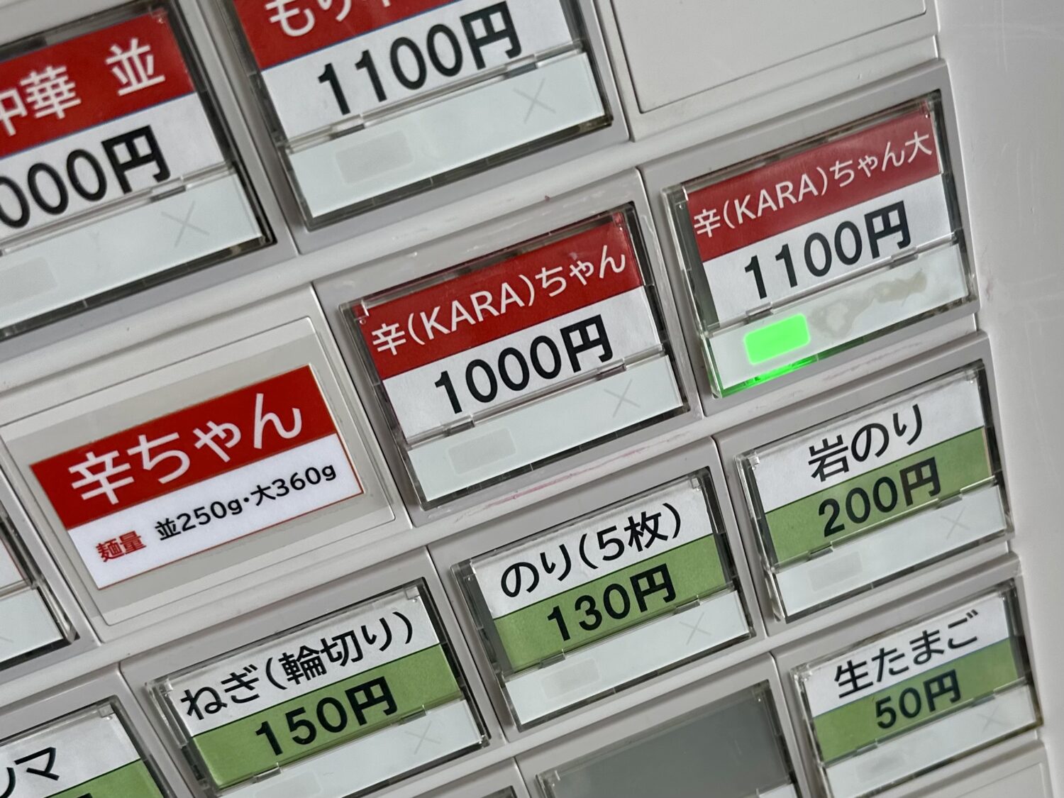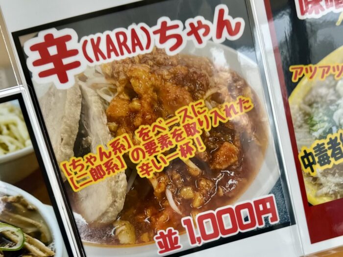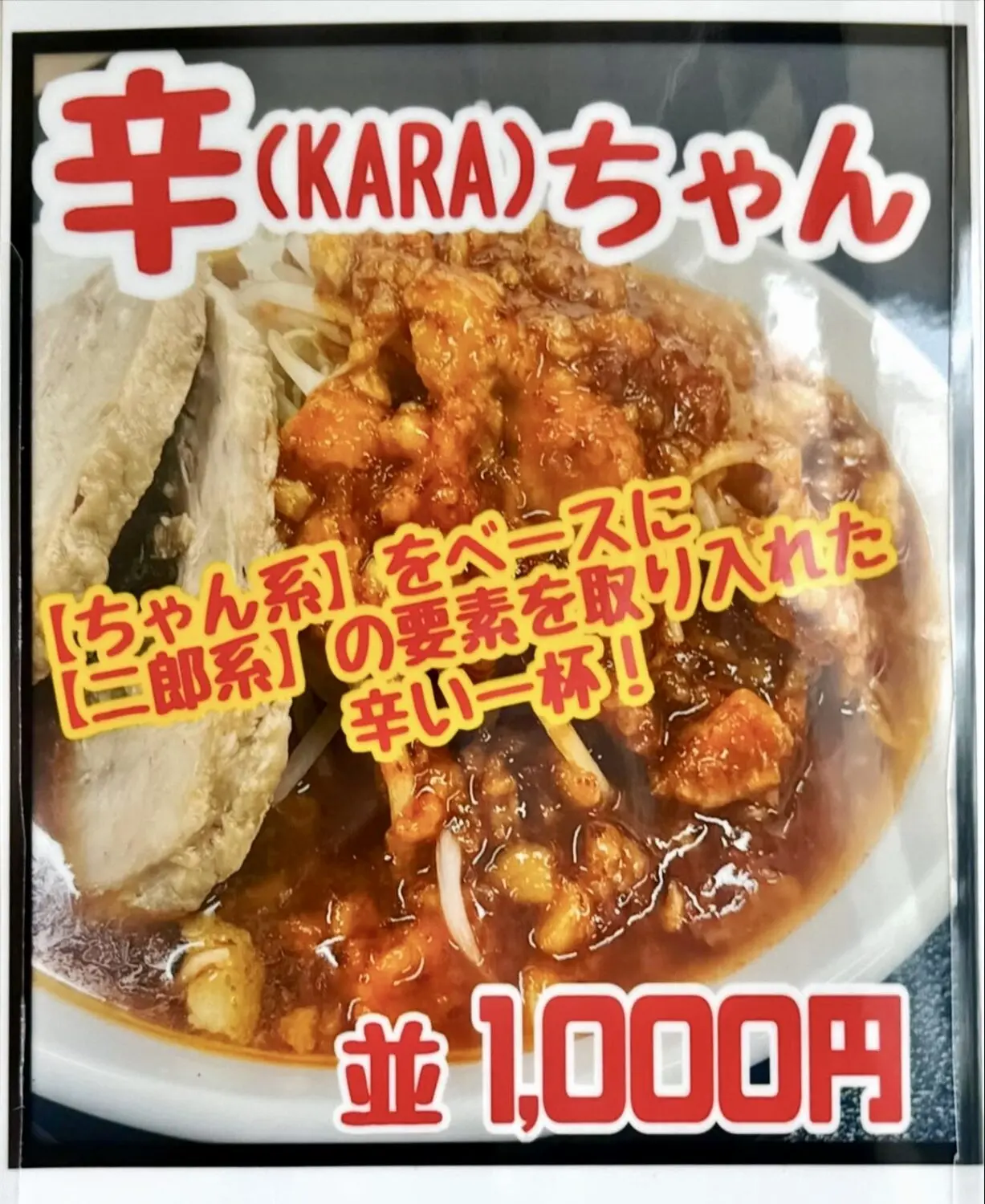 その名も【辛(KARA)ちゃん・大】税込1,100円、「ちゃん系×二郎系」がテーマのいわゆる二郎ちゃん、いやチャン・二郎か。