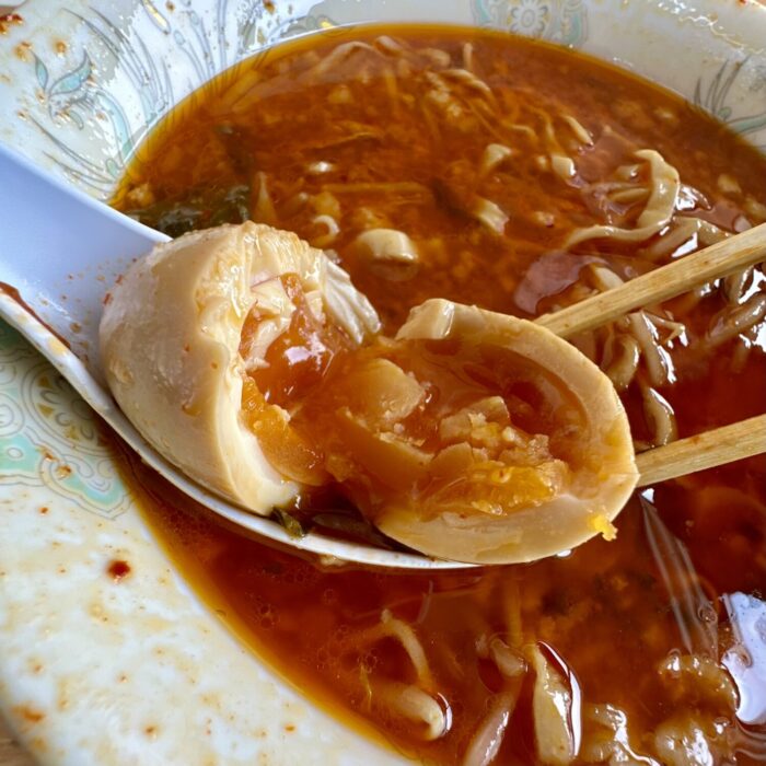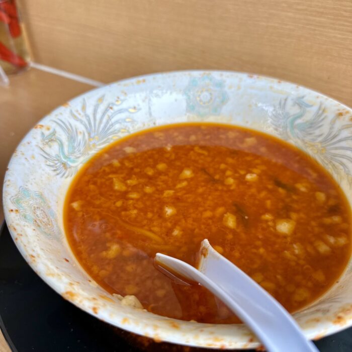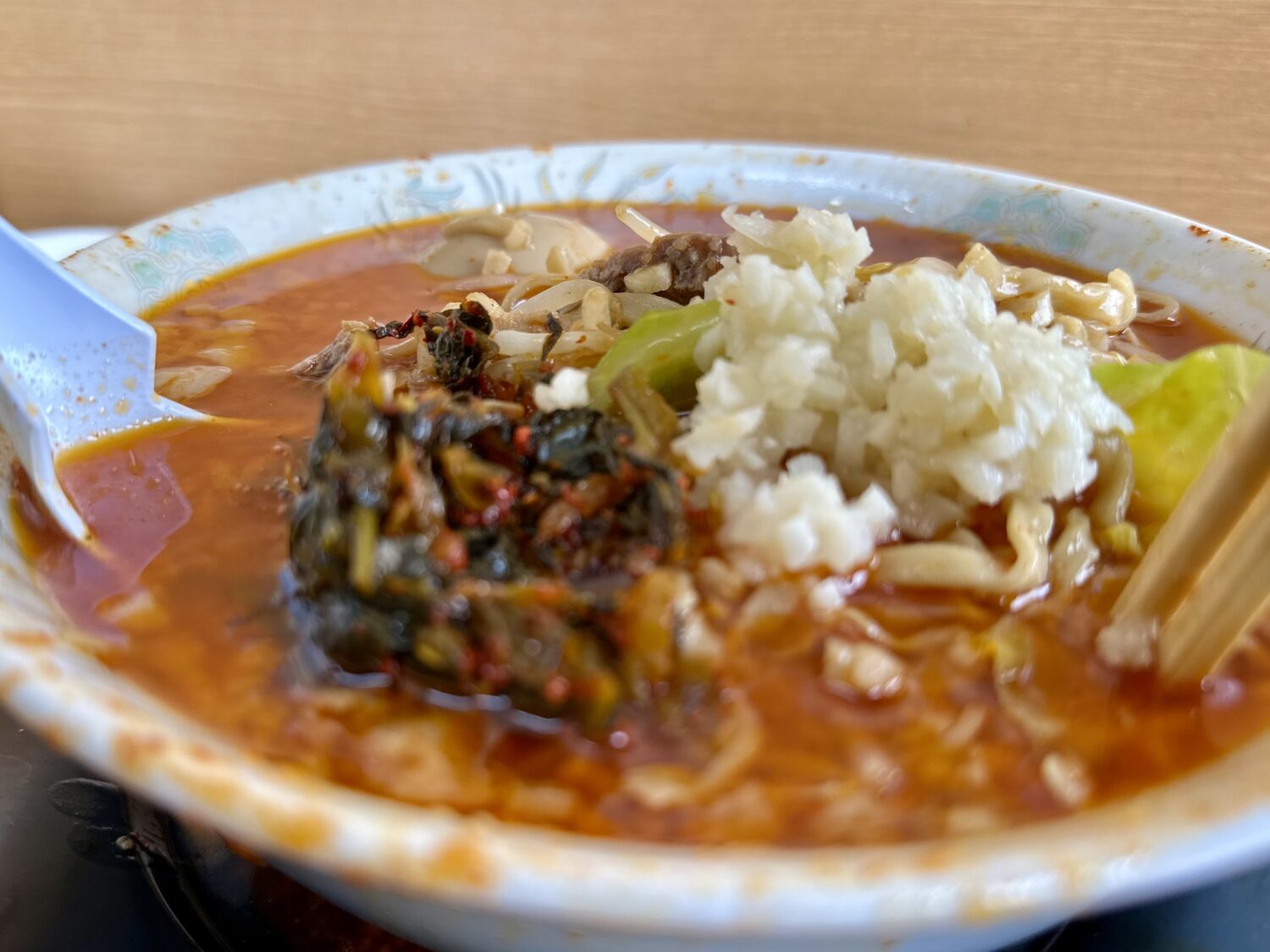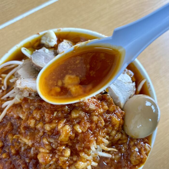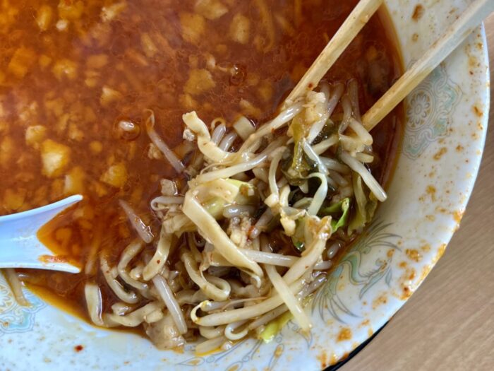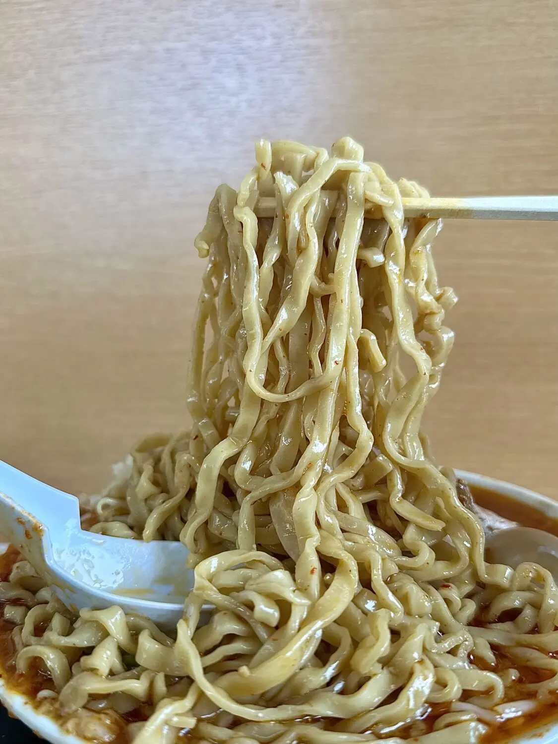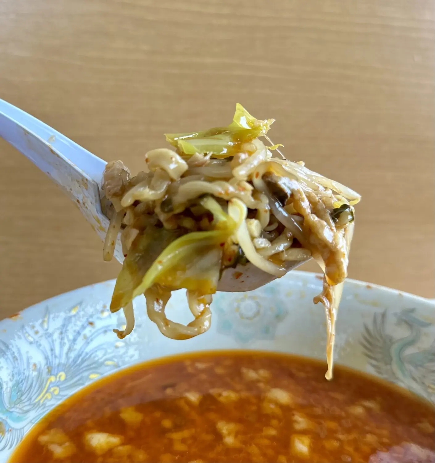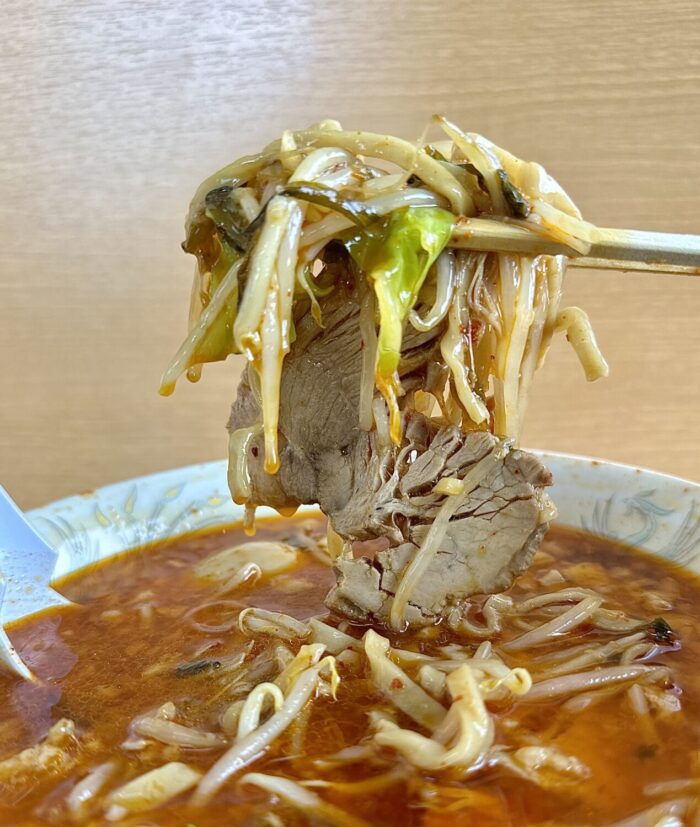 まずはスープを一口、すると激辛っぽいその見た目とは裏腹に、万人に喜ばれるタイプの旨辛仕立てでホッとする