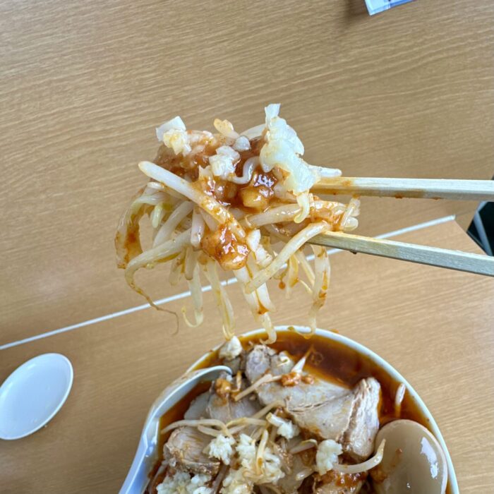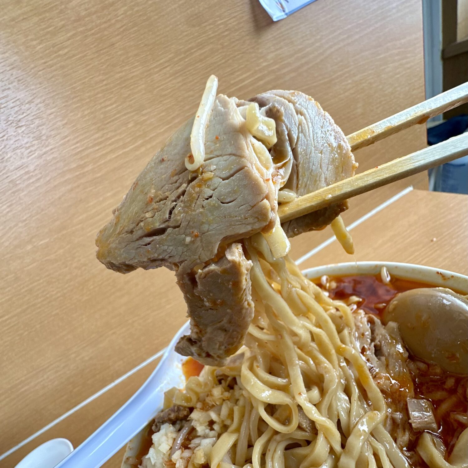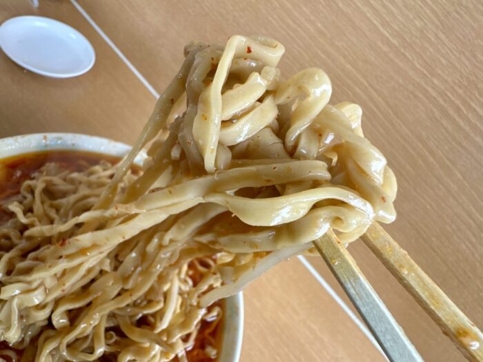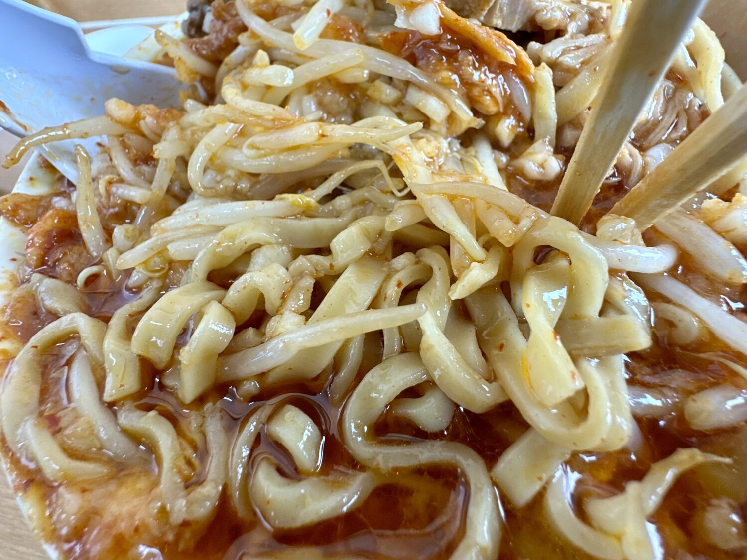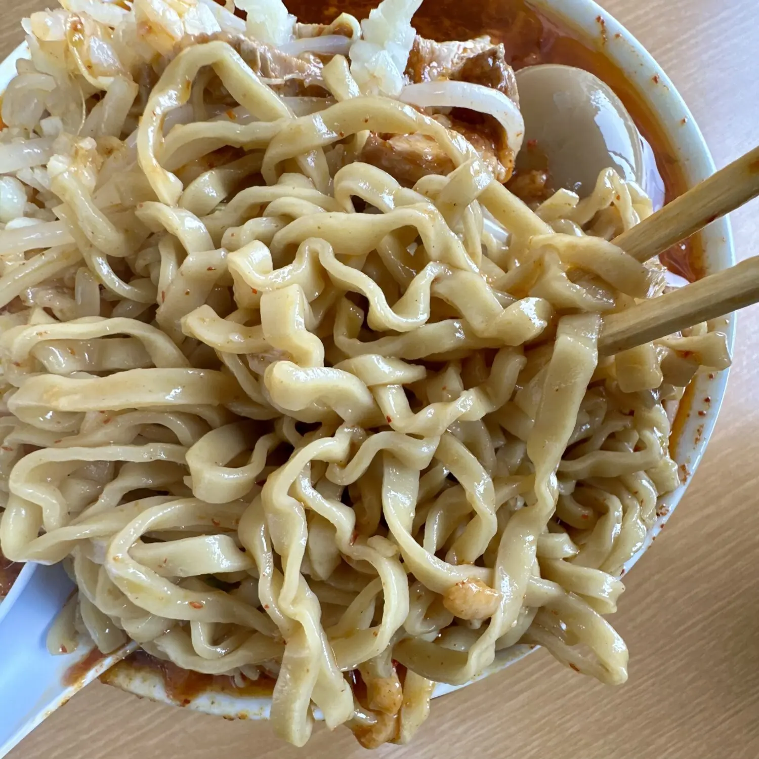 あぁこの麺すっごい美味い、美味くて旨い上に旨辛のプガスープとの相性ゼッツヨに目ちゃんこウマイ