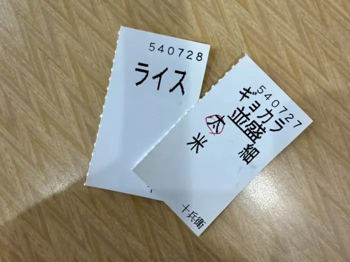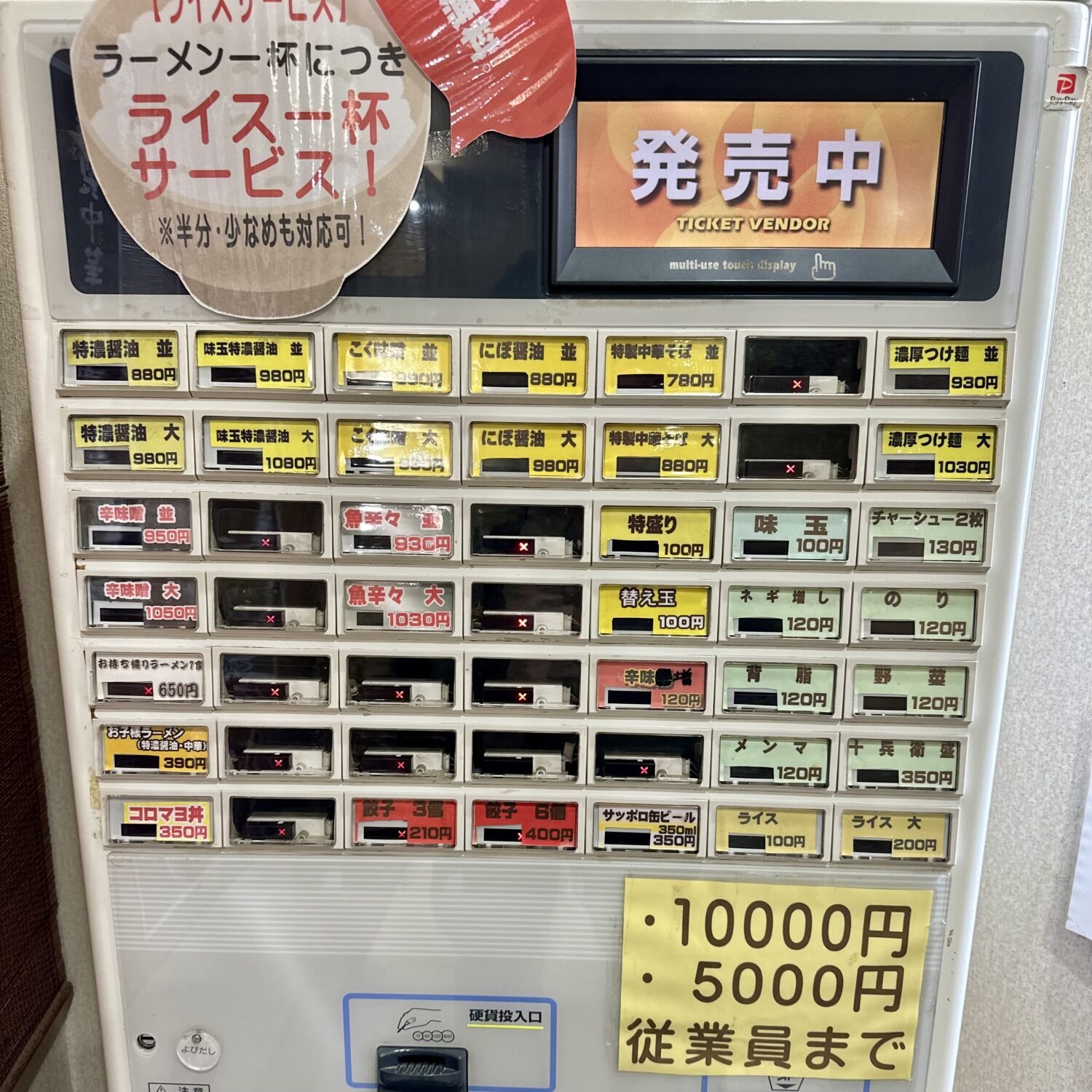 なんとラーメン注文者にかぎり半ライスサービスの十兵衛で、それ忘れてライス食券も買ってしまう大失態:(;゙゚’ω゚’):