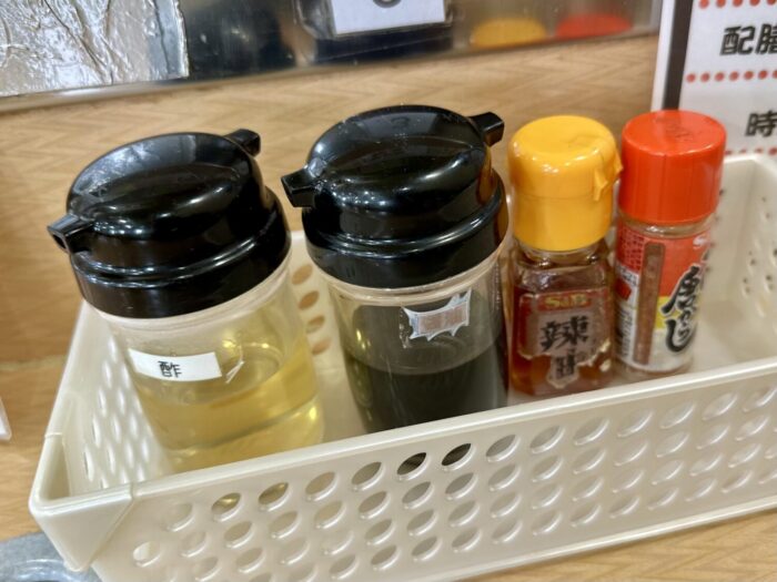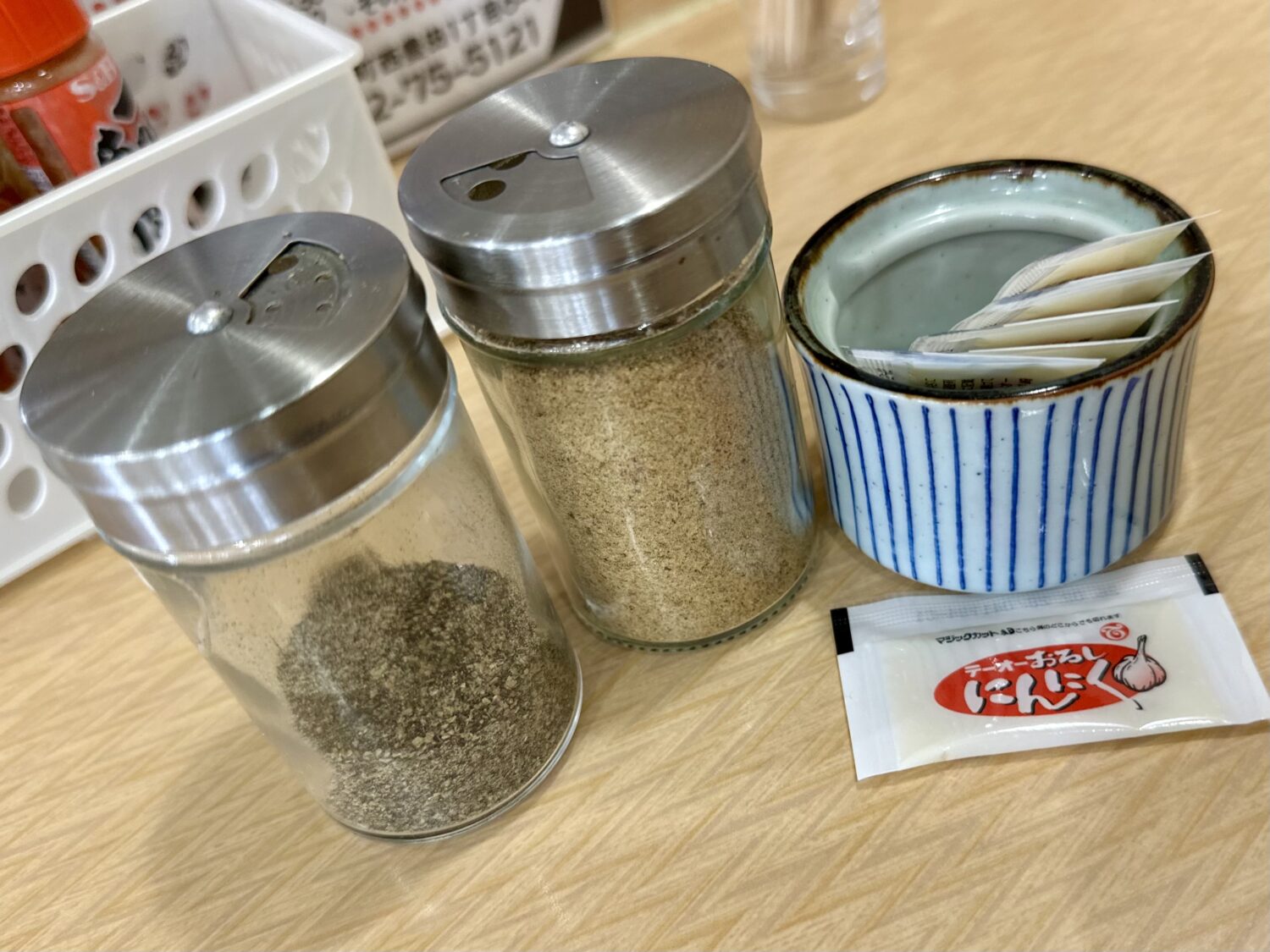 いっぱい並ぶ卓上調味料には僕らに嬉しいニンニグ&魚粉の姿、たいていのトッチャ衆なら皆んな好き