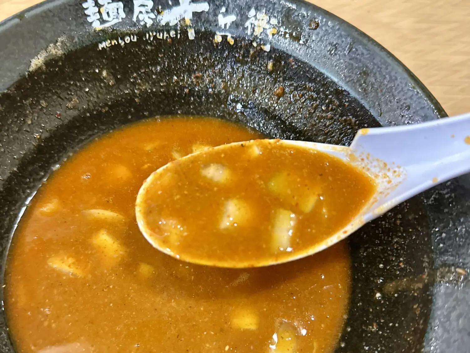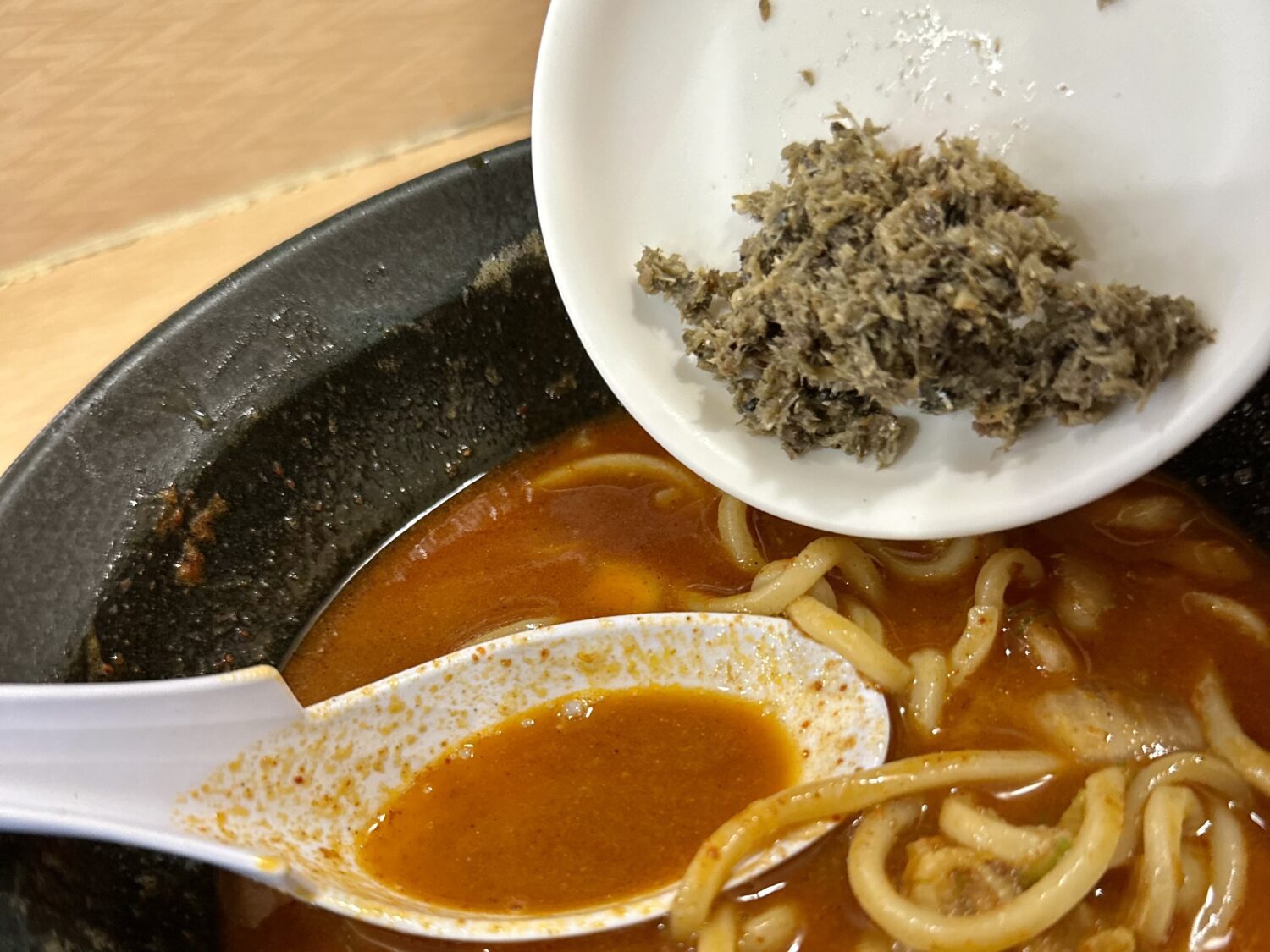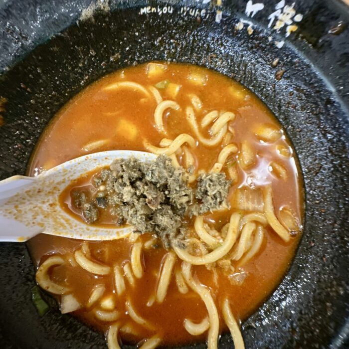 なんてったって十兵衛ならではの煮干しスープに特製魚粉、そこに食欲カンフルの辛味だぉん、そりゃハマる美味さに間違いない。