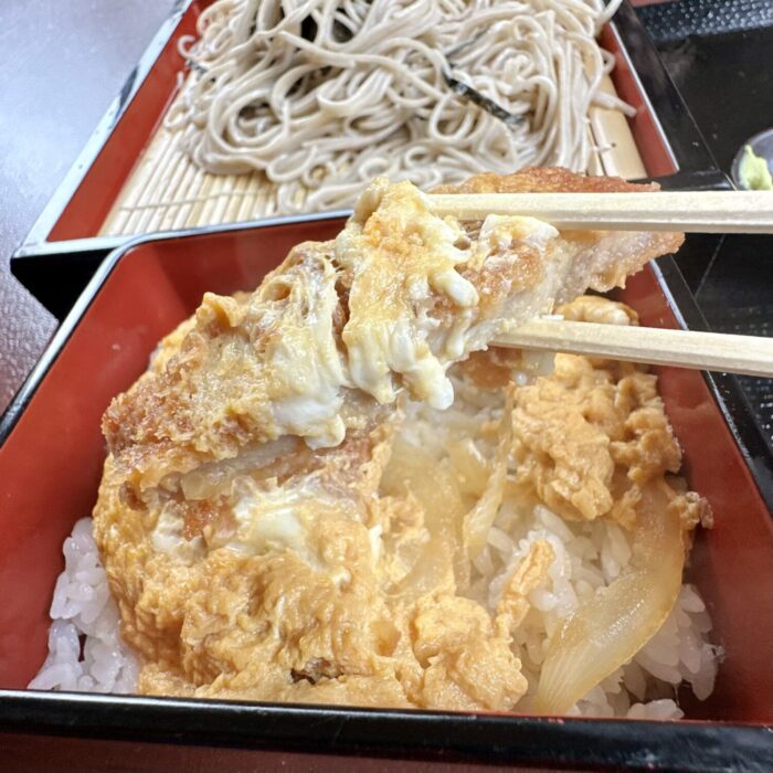 出汁感びぢゃびぢゃのミニかつ重に、キリッと立ったしゃっこいソバの大盛りが並ぶ、ある年代以上にとってのハッピーセットがまさにこれ。