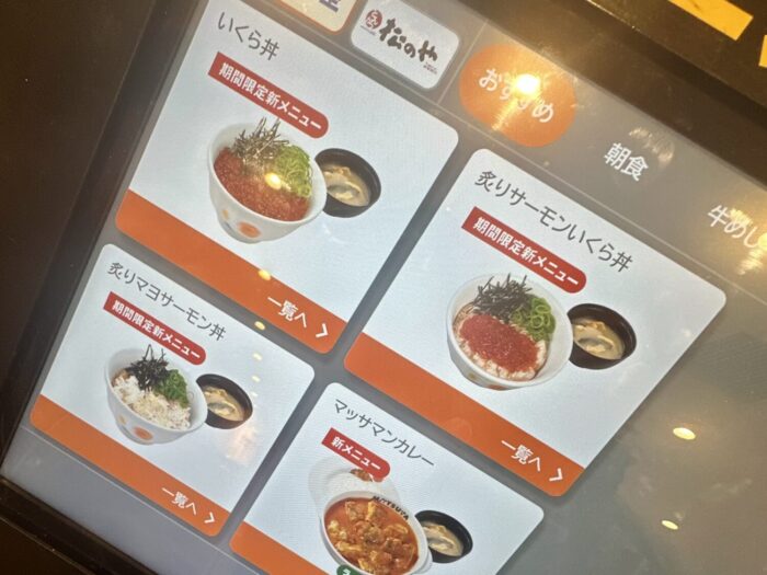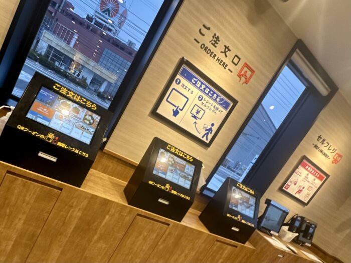 まずは向かって左手側のオーダーマシンによる注文確定、フルタッチ式の画面ぽちぽちで食べたいものを探すところから
