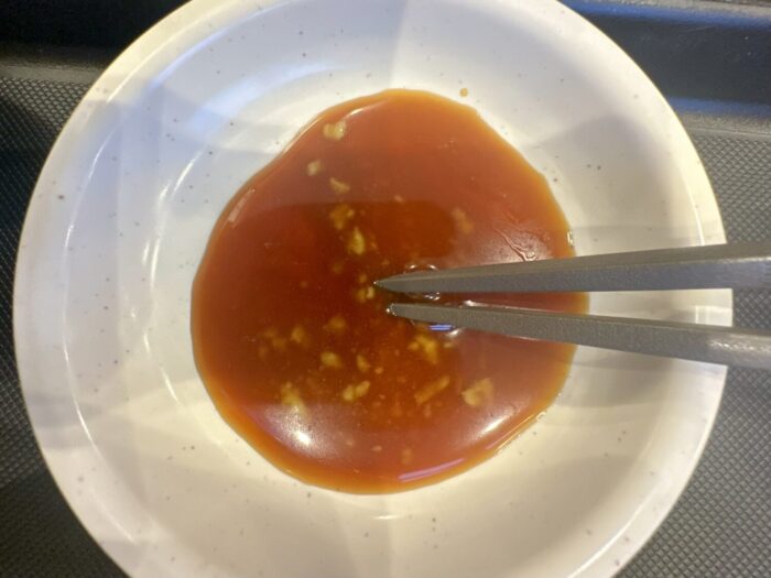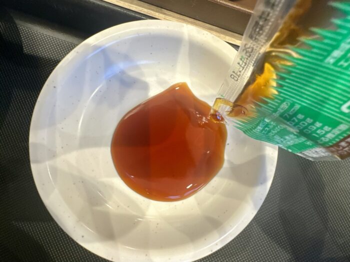 まずは小パック醤油に小パックわさびを溶かす作業、