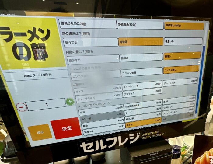 だからせめて早い段階でオーダーマシンのアップデート、「味の濃さは?」「野菜の量は?」の並びに「麺の硬さは?」まで追加してくれたら喜ばれると思うのよ(´⊙◞⊱◟⊙`)