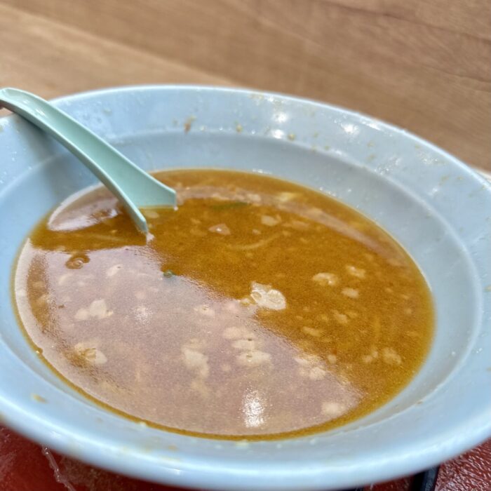 カエシのトゲトゲしさのない丸い飲み口が特徴的で、フーフーいらずの汁温度低めでイケる人ならガブガブ飲める非乳化スープ
