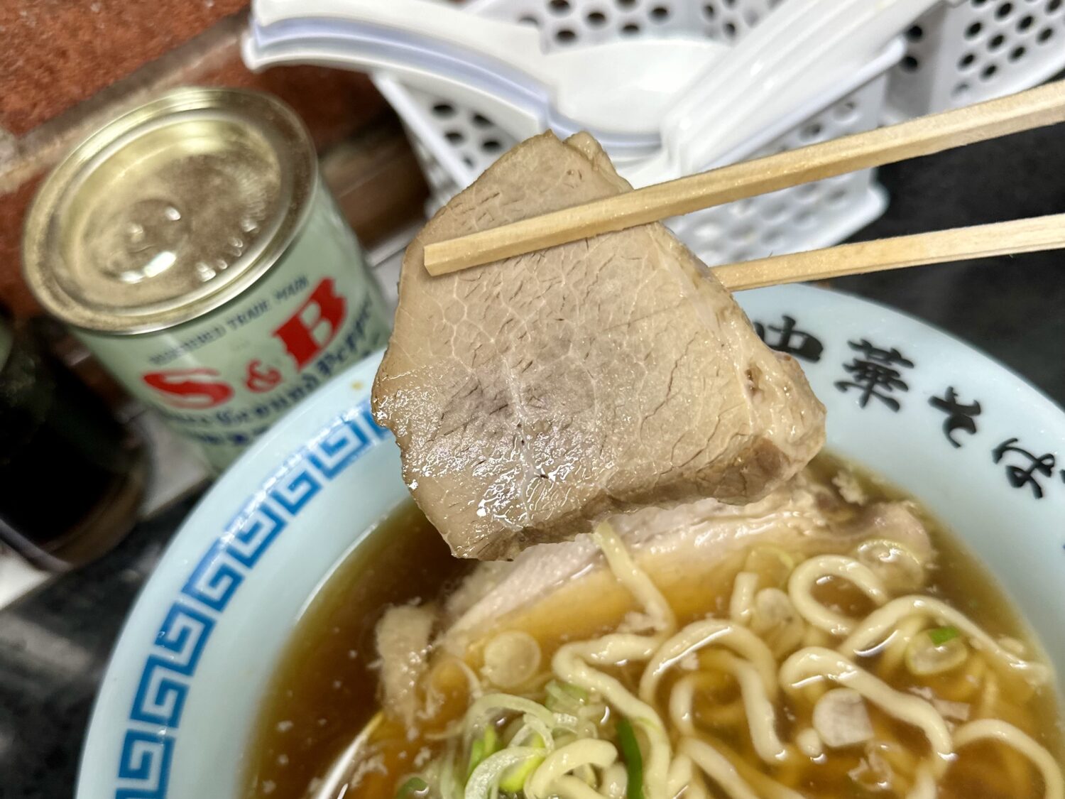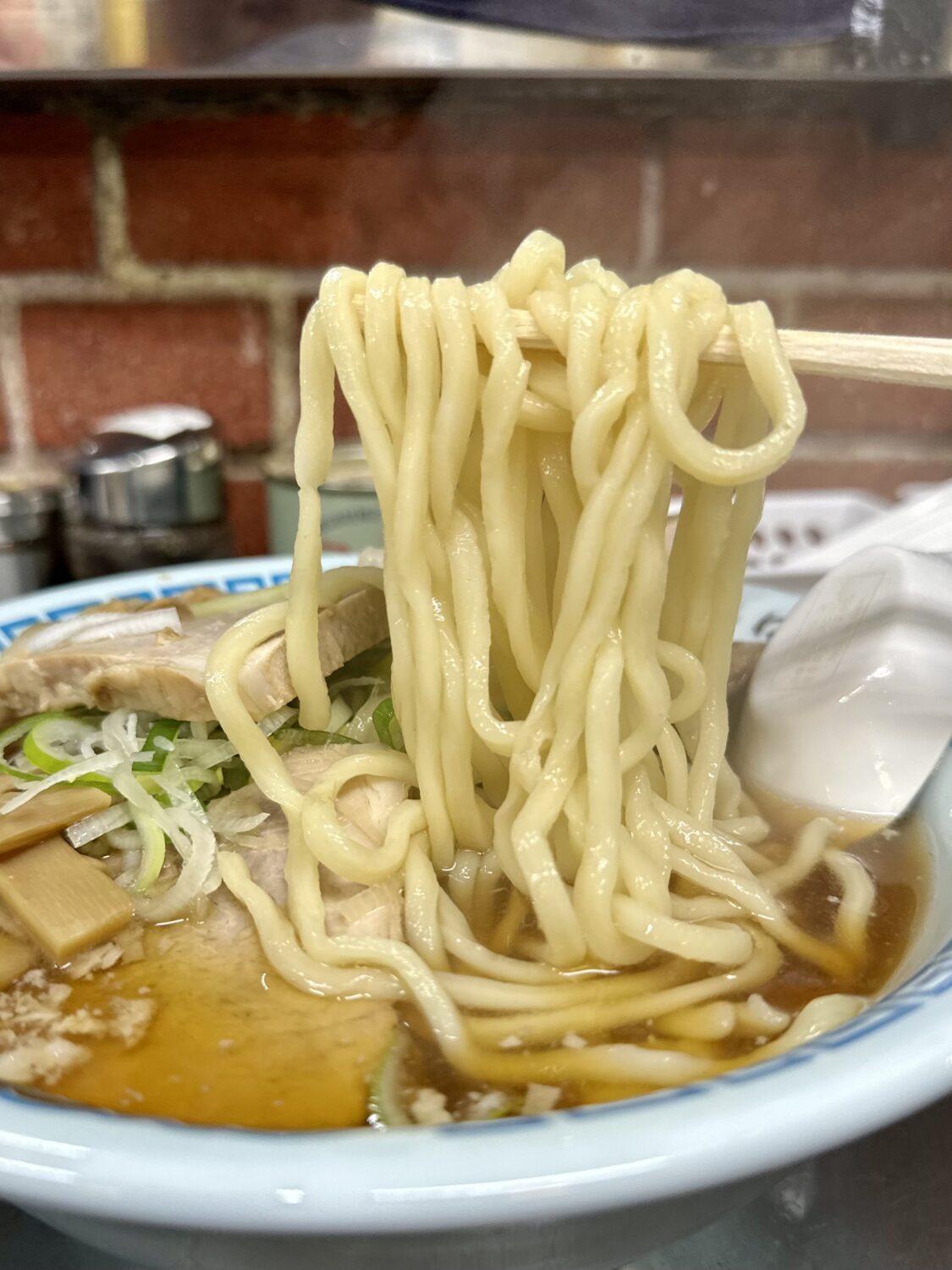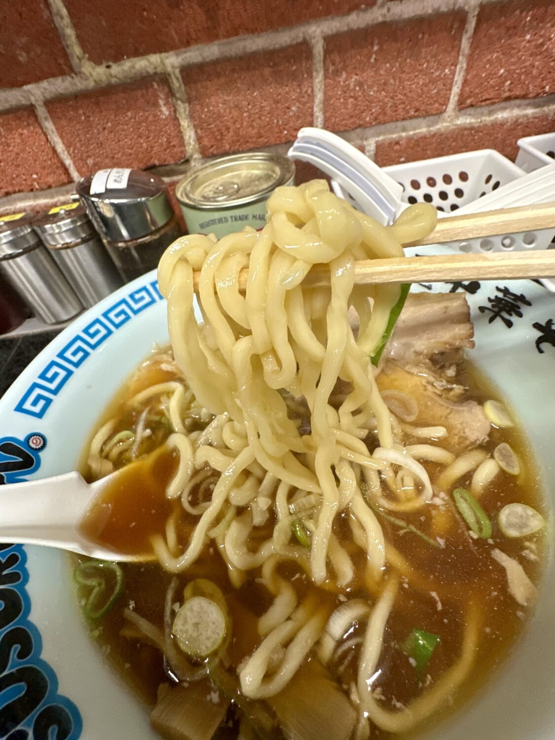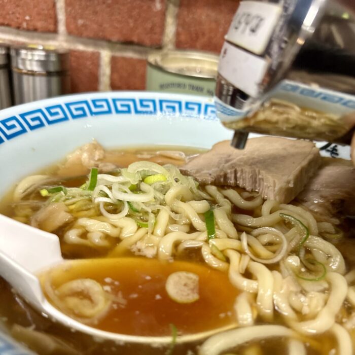 本家本流に比べるとややショッパミ抑えたスープとチャーシュー、これはこれで万人愛されキャラで高好感度、足りなきゃ卓上の追いカエシで調整可能ってのが素晴らしい。