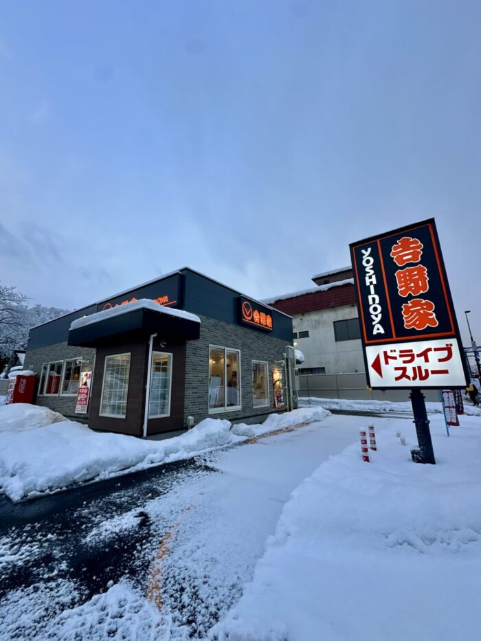 とある雪降る空の下、去年7月に出来たばっかで反対車線から入るの難易度Sな吉野家にハイボールマンが来ましたよっと(((◞( ・ิ౪・ิ)◟
