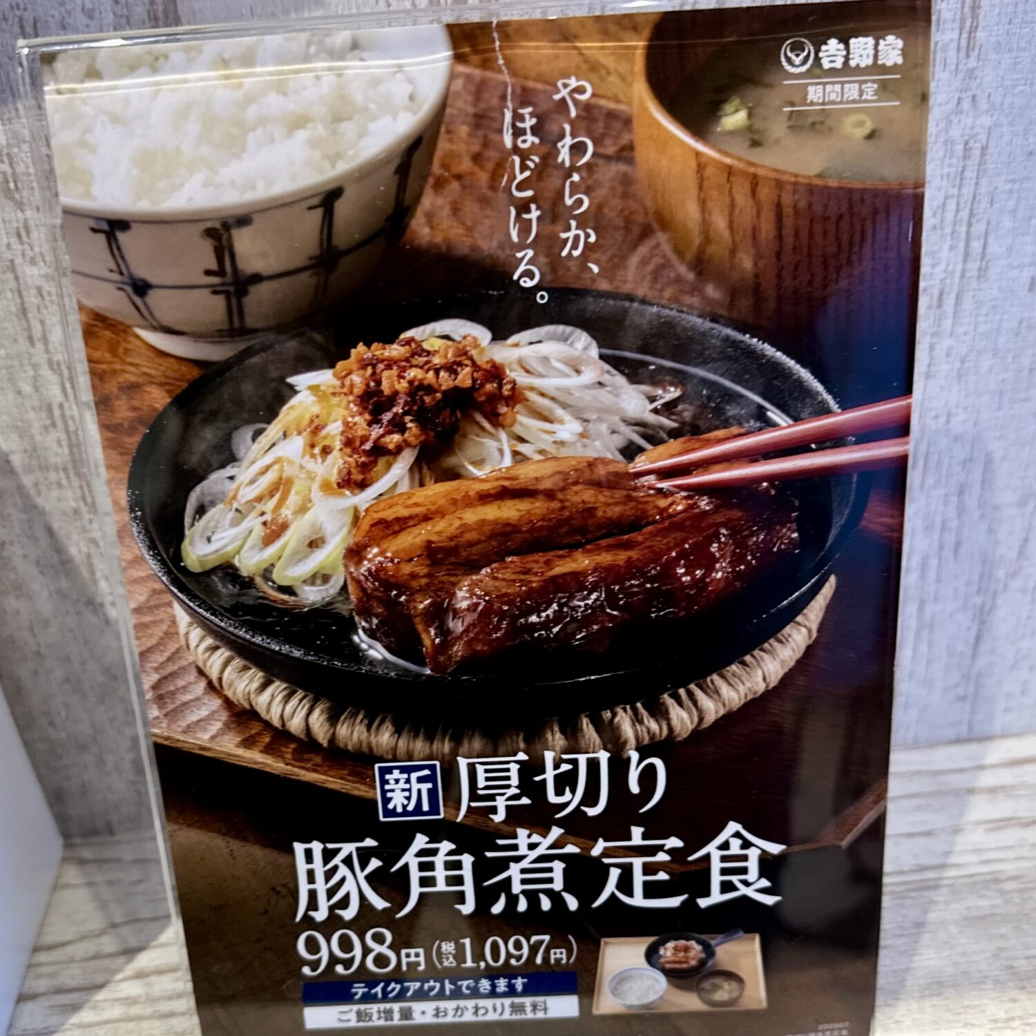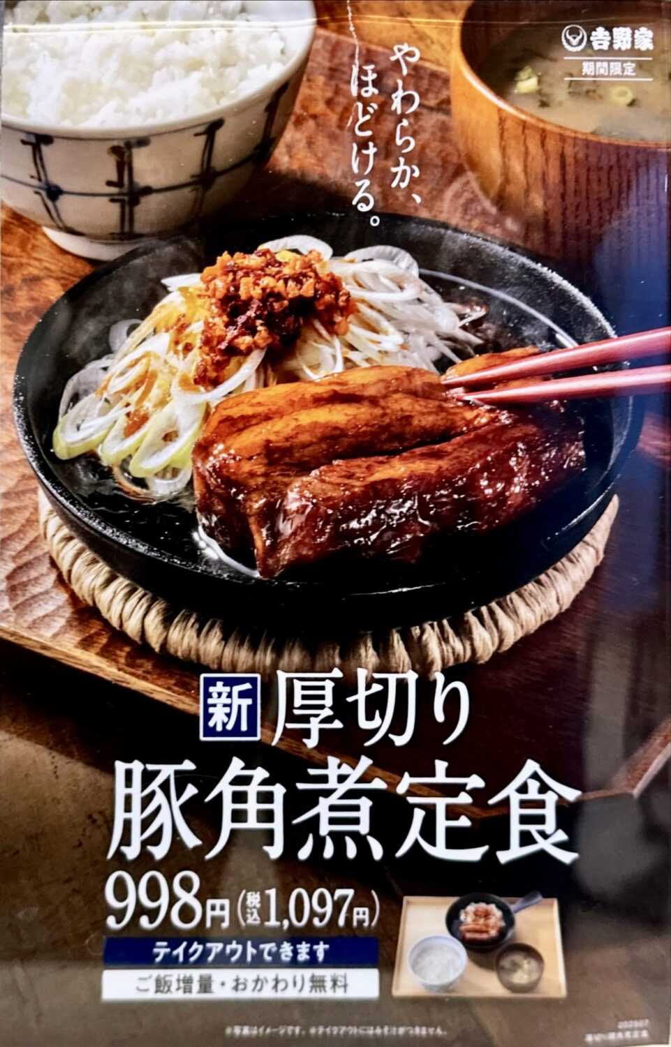 それは期間限定にして数量限定の超レア品、もはや眺めるだけで福が来るとかどうとかの【厚切り豚角煮定食】税込1,097円。