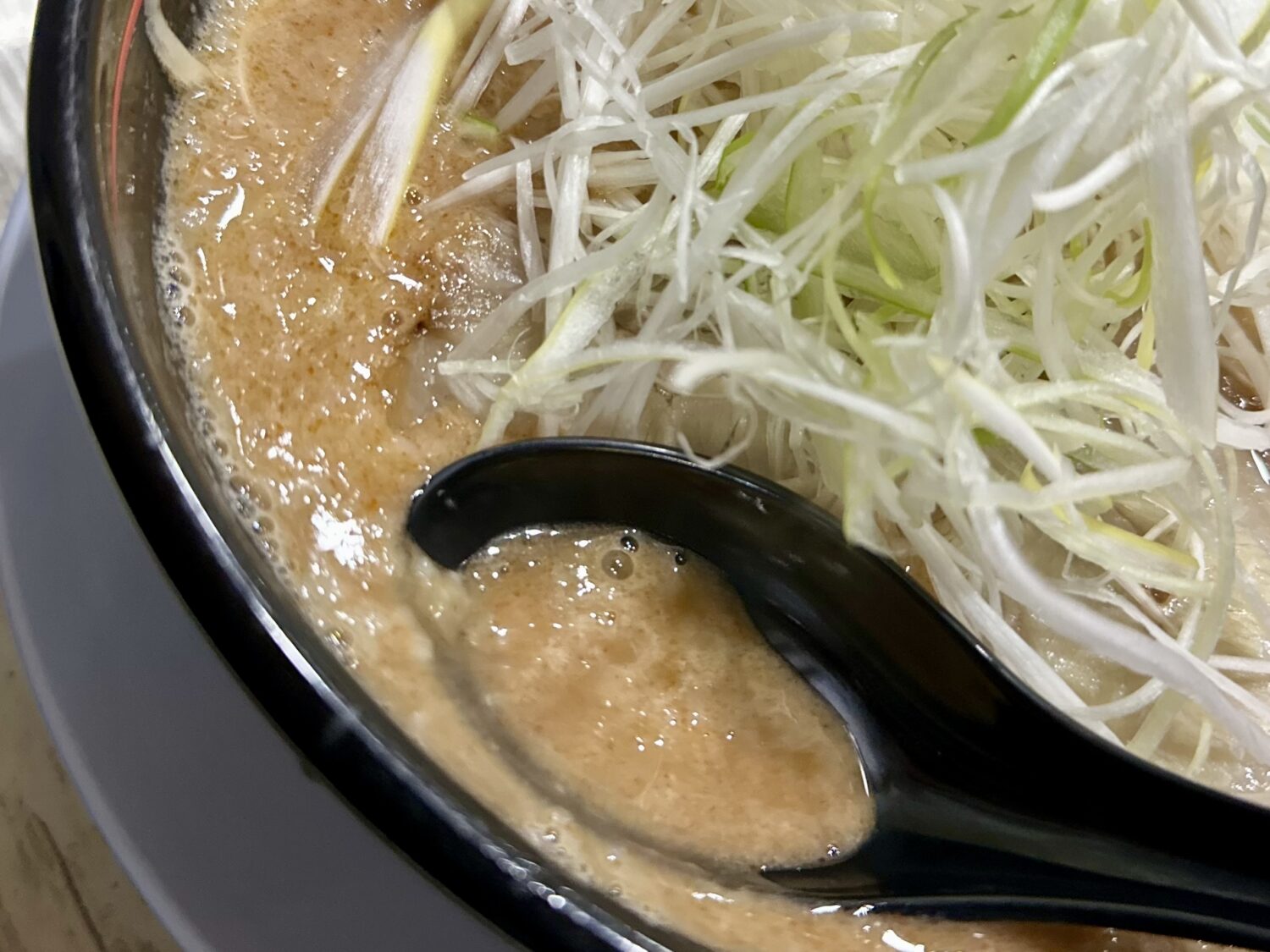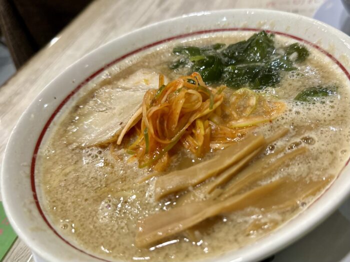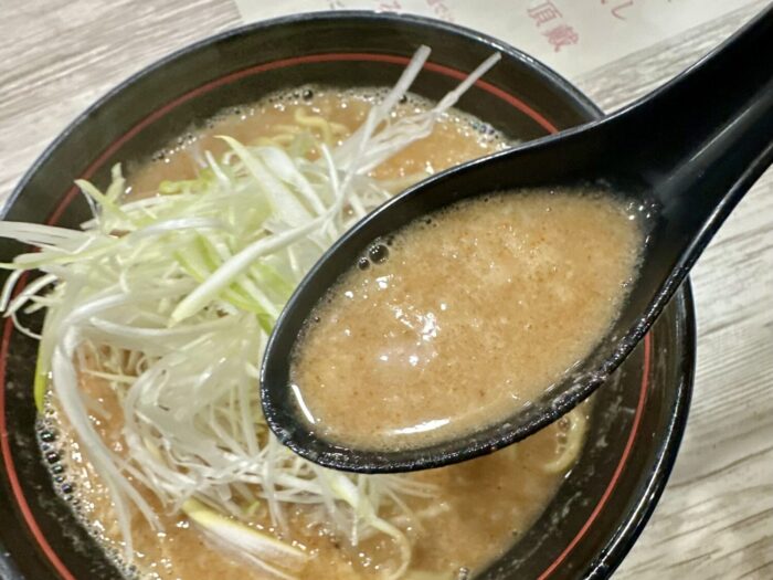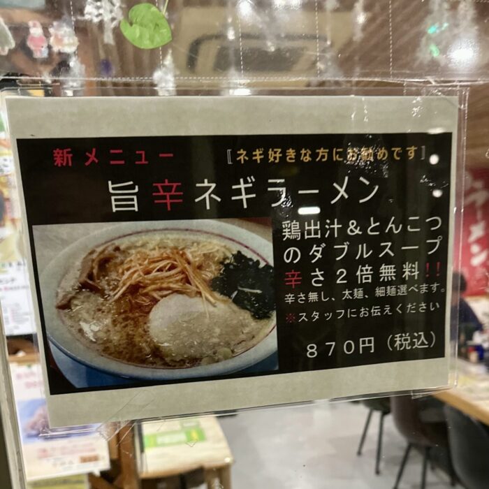 キャッチフレーズは「鶏出汁&とんこつのダブルスープ」、選べる辛さに太麺/細麺の選べる麺でネギ好きにはたまらん一杯