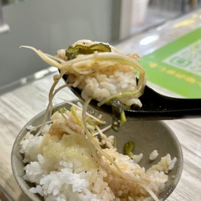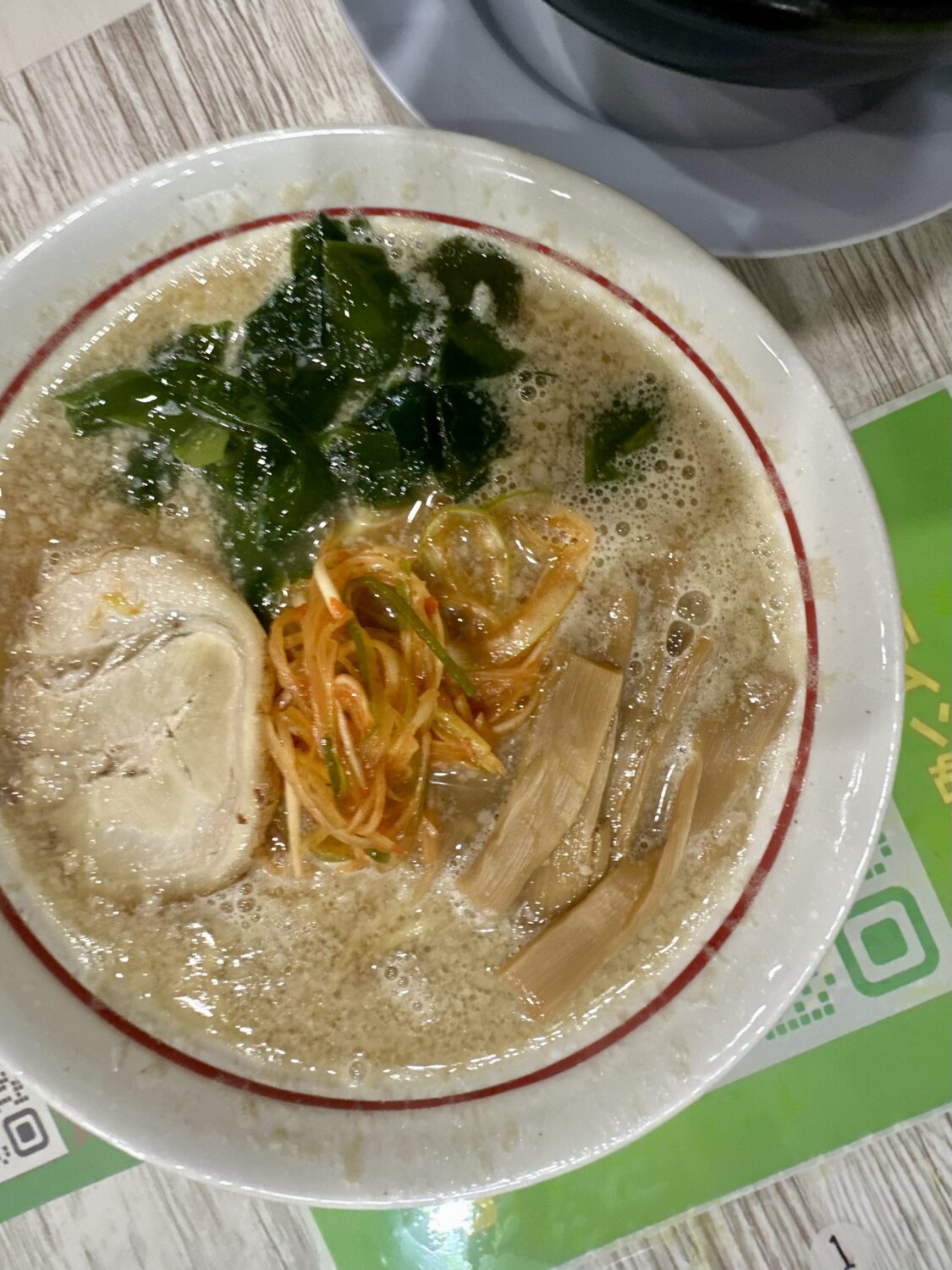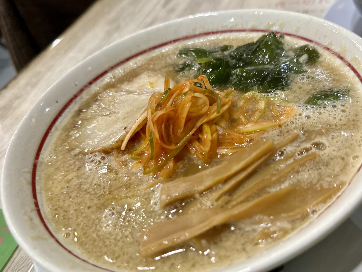 乗せ具材は辛ネギ、チャーシュー、メンマにワカメと必要十分