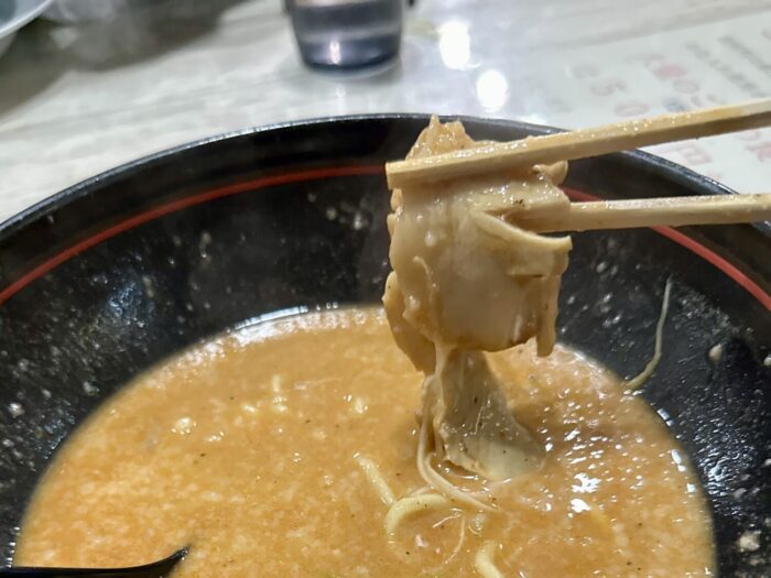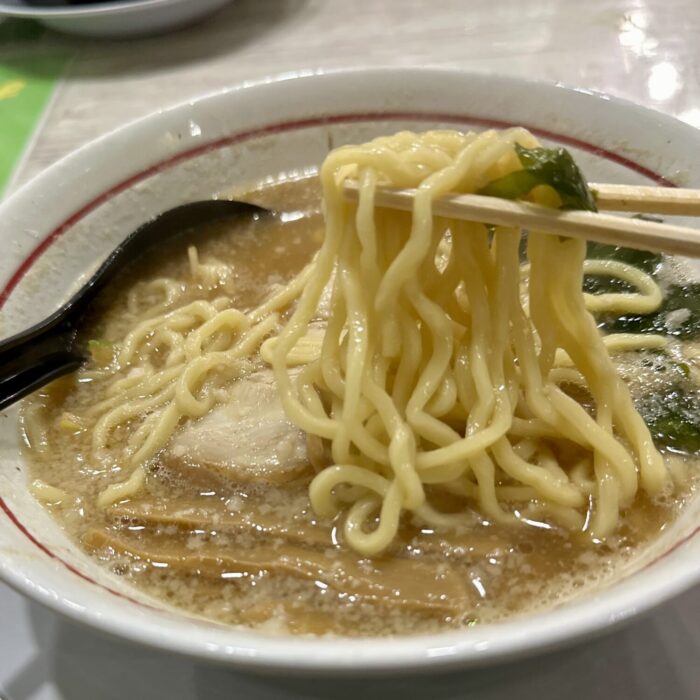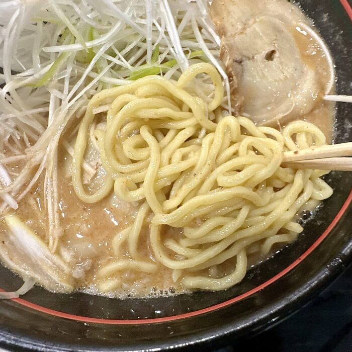 麺山といえばやっぱりこの麺、コシ強かつ喉越しストロングの太ちぢれ