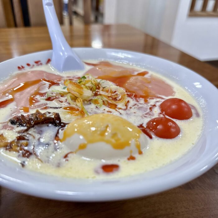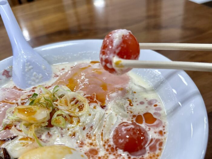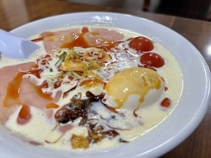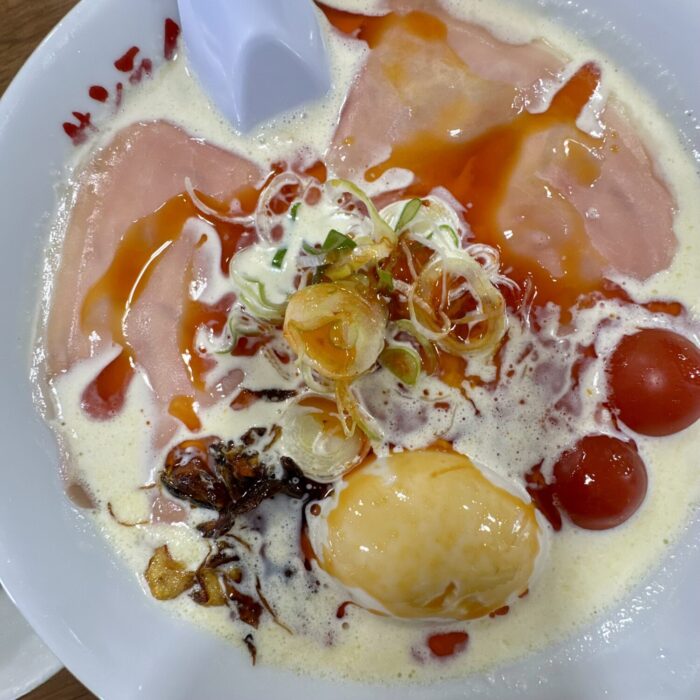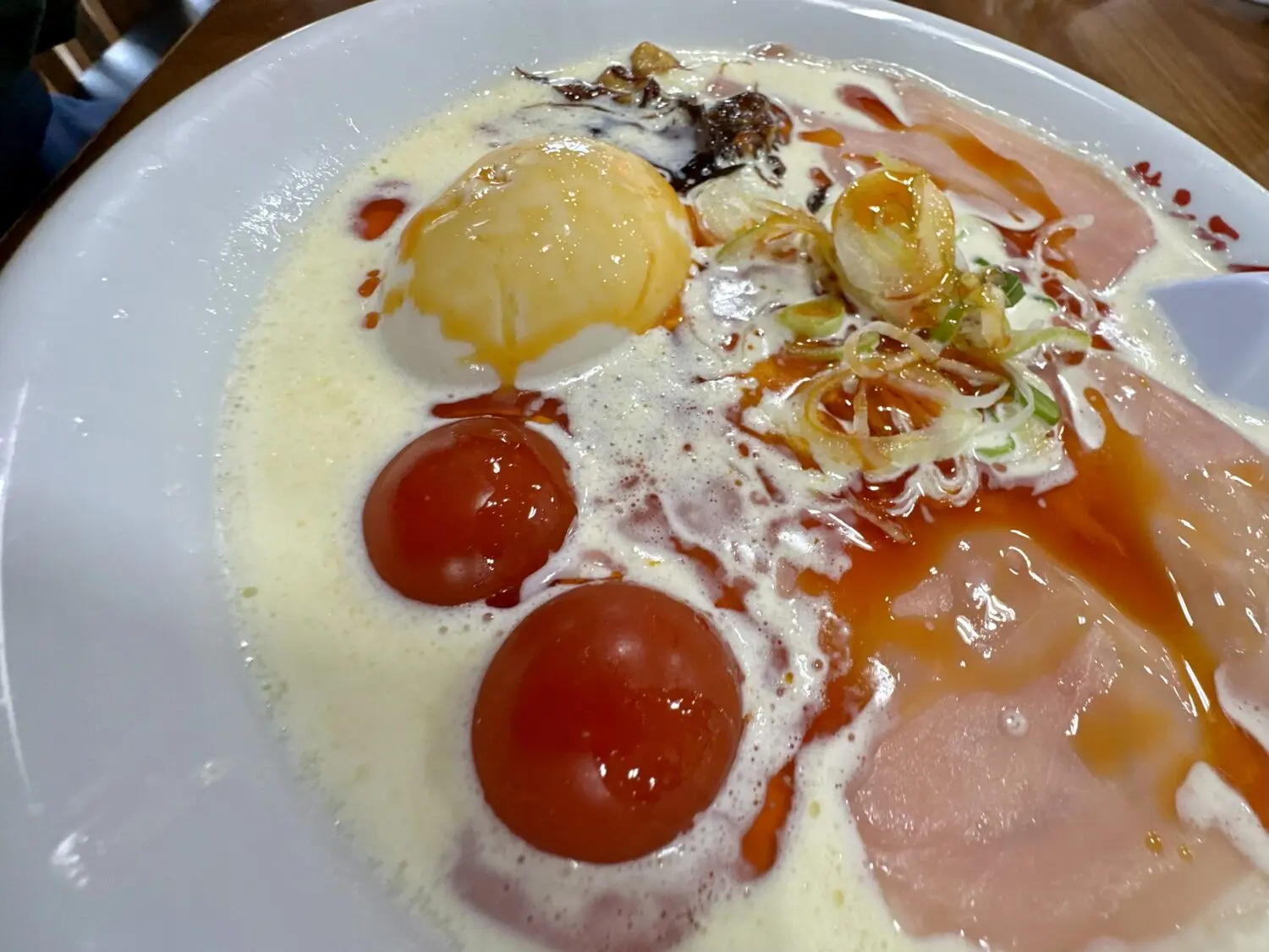 乗せ具としたらミニトマトに味玉に生ハム、ネギ、焦がしたネギ