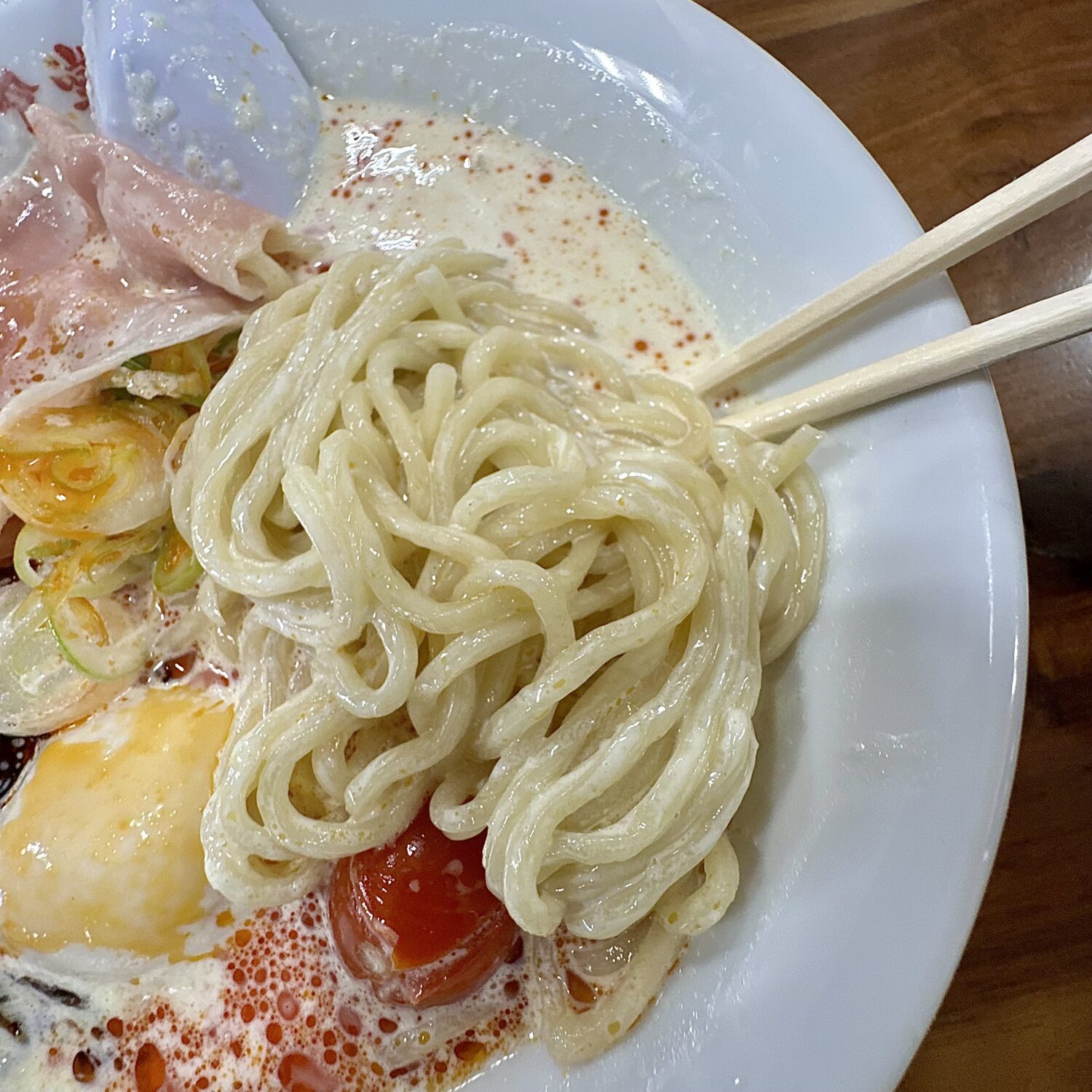スープよく絡むこの麺が、ススったときにテーブルに飛沫がまぁ飛ぶ飛ぶ、しかもスープ白いもんだからまぁ目立つ目立つ