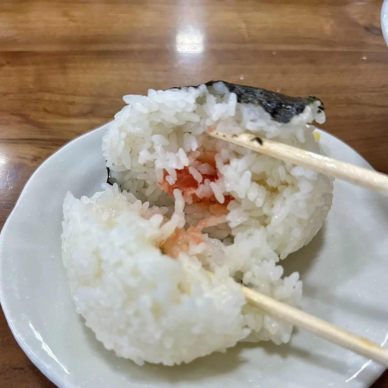 注文受けてから握り始めるサンライズのおにぎりは、そのデッカさもあって手で持って喰うと割と早い段階から崩壊始めるから箸喰いがファーストチョイス