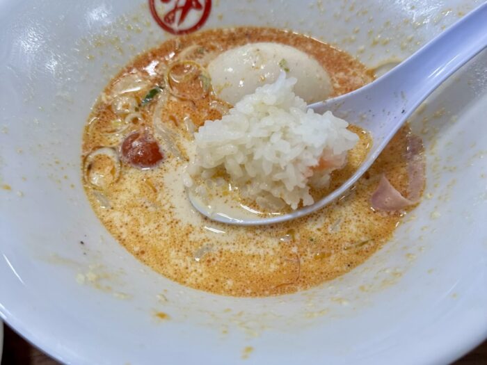 さらにほぐしたおにぎりをレンゲに乗せてのガブムシャゴックン、浸し喰いは計画的に