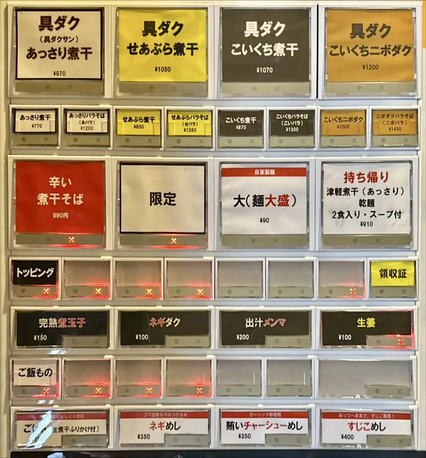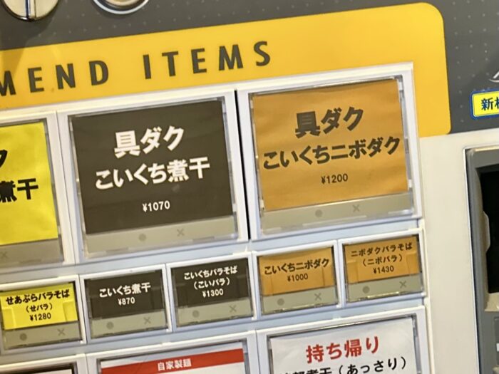 大きくは3つ、トッピングパック「具ダク」の設定と、ネギダクが+100円TPの1種になったこと、そして超レア商品「にぼダク」から”限定10食”の表示が外れてたってこと。