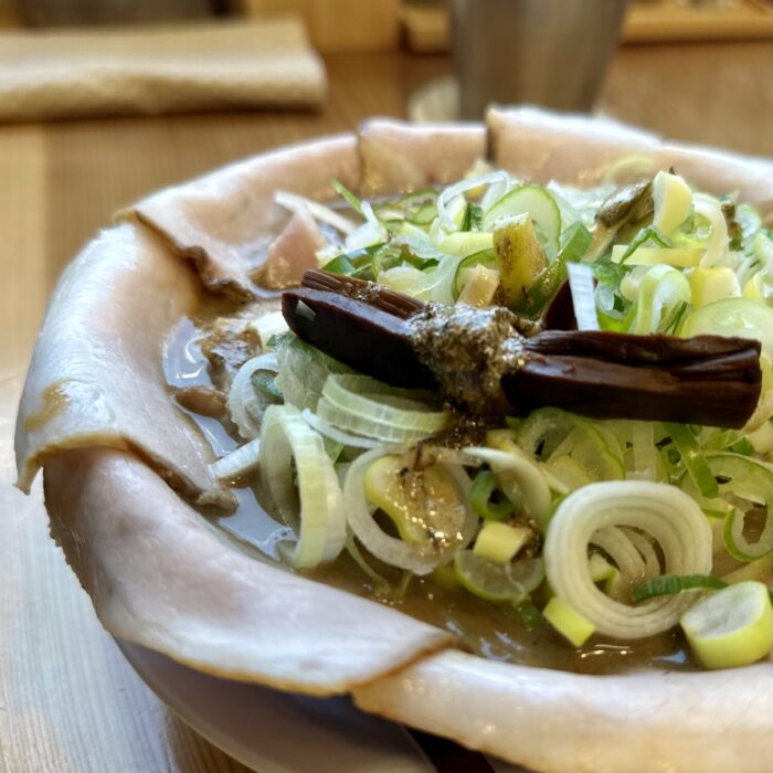 なんと超極濃ニボシスープの「にぼダク」のバラそば版、それを麺増量にしてネギマシに喰うっていう、いわゆるバチ当たり待ちのやづ。
