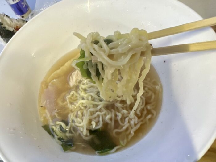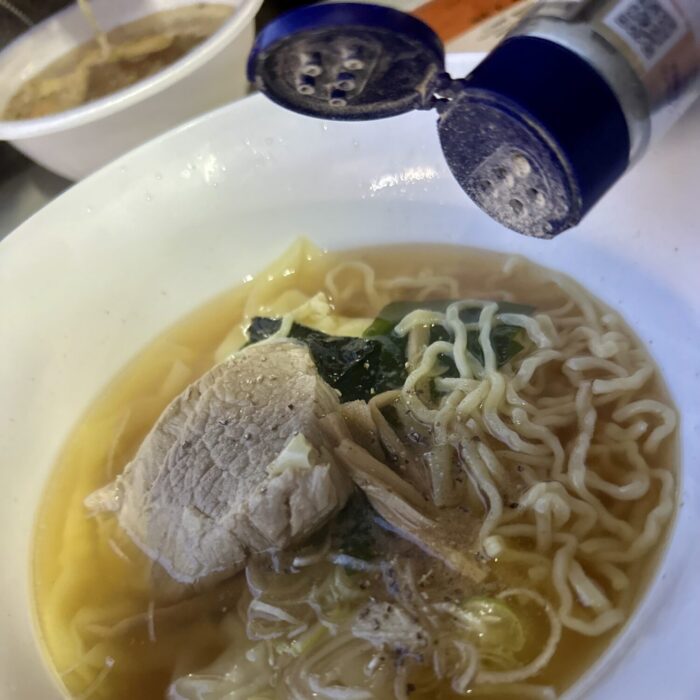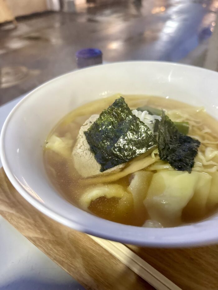 澄んだスープにチャーシュー1枚とネギ海苔ワカメ、そしてスープに透けて見えるワンタン数個