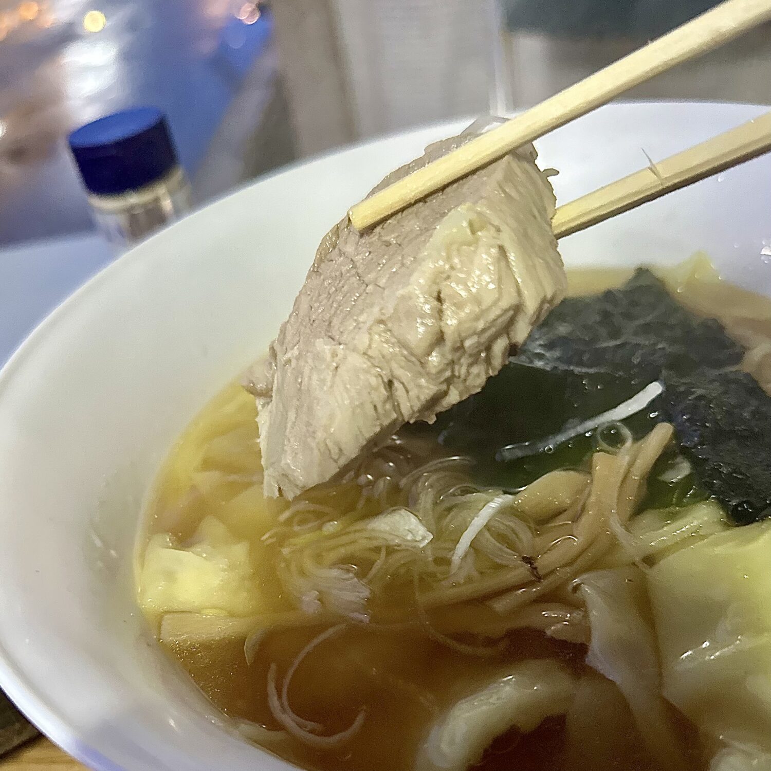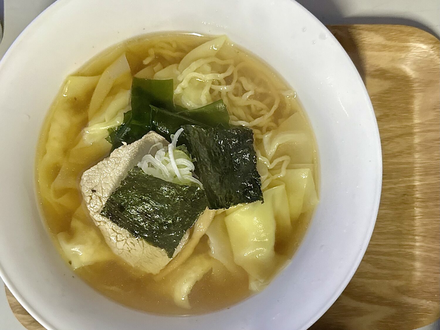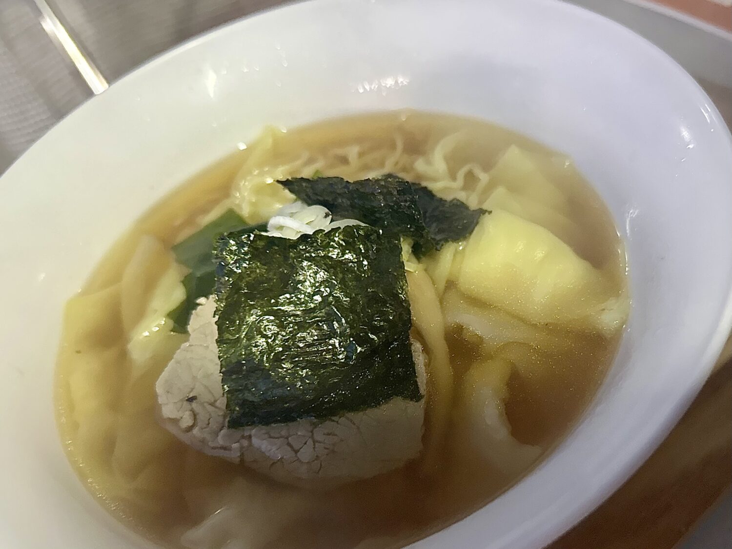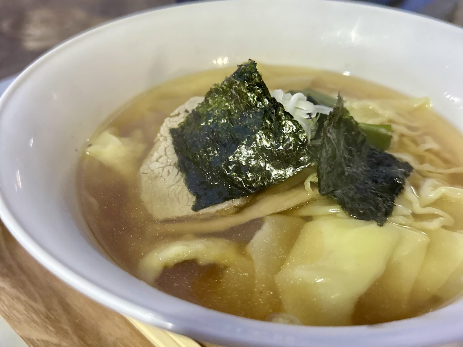澄んだスープにチャーシュー1枚とネギ海苔ワカメ、そしてスープに透けて見えるワンタン数個