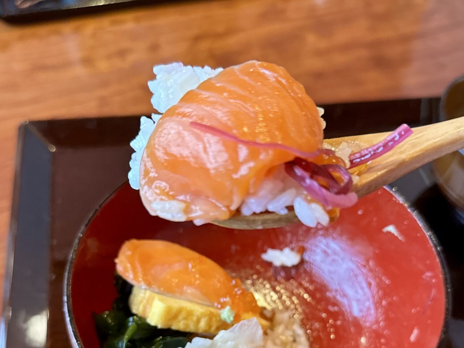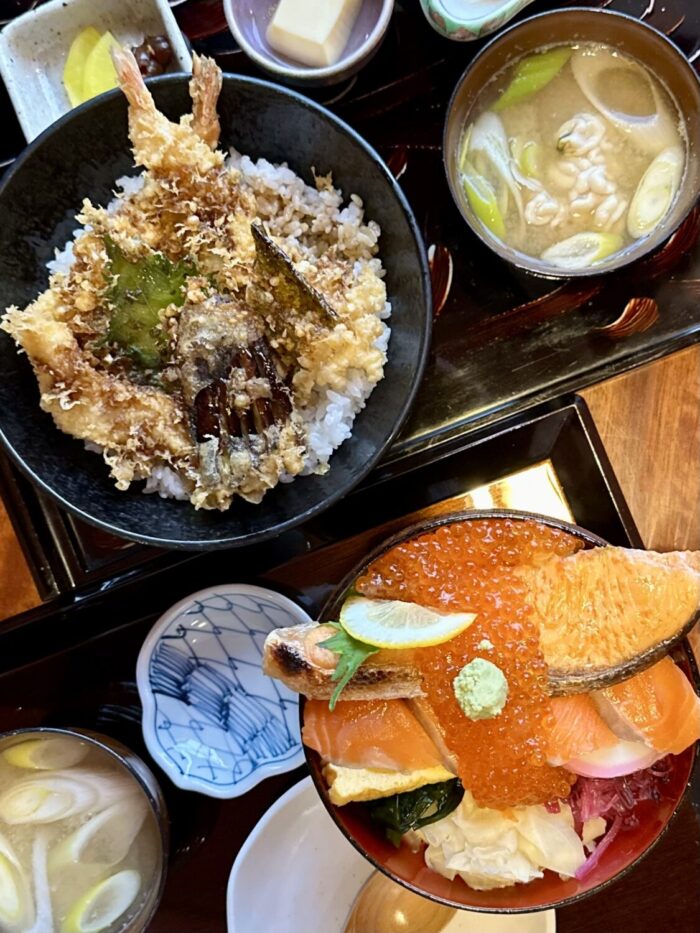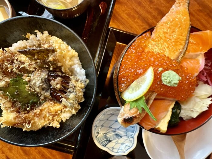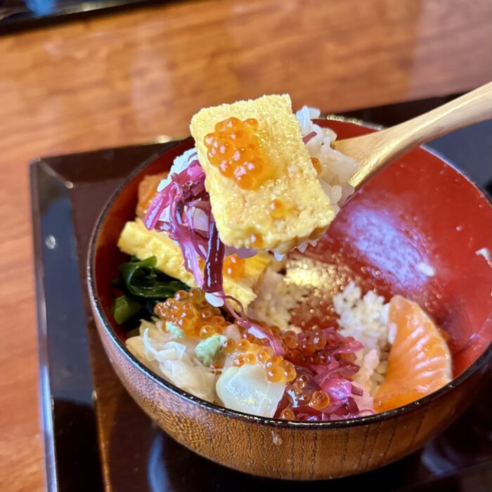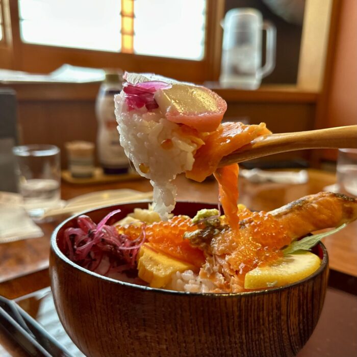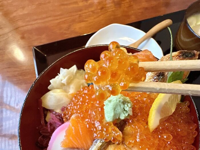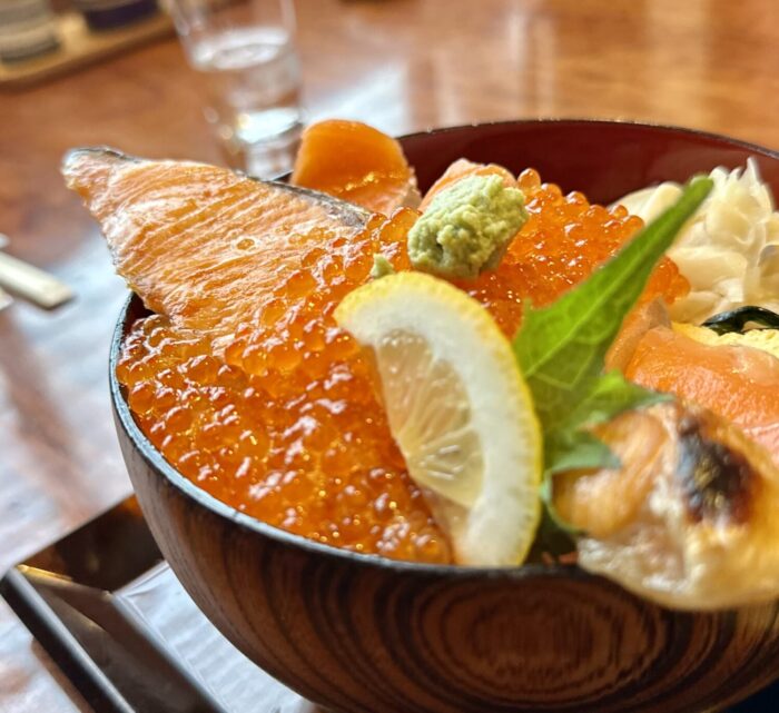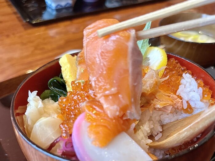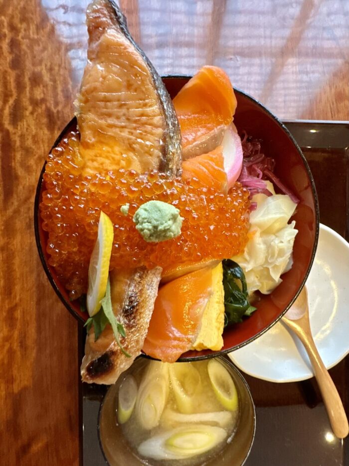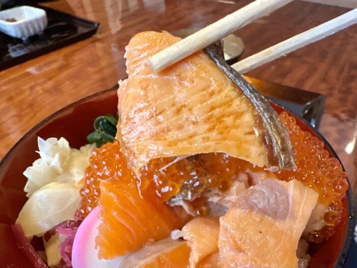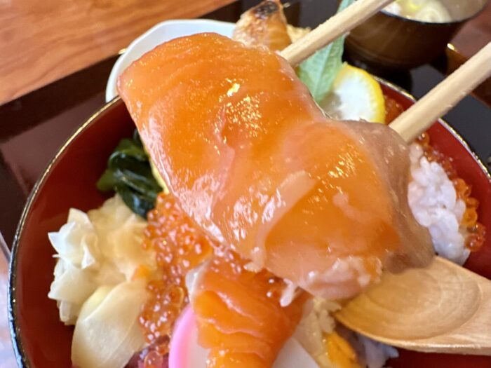 読んで字のごとく、たっぷりご飯の上にドカンと寝そべるギンジャケの魅力にぷりぷりプツプツの赤い宝石、そしてさらなる華添える海峡サーモンぽい赤身の刺身。
