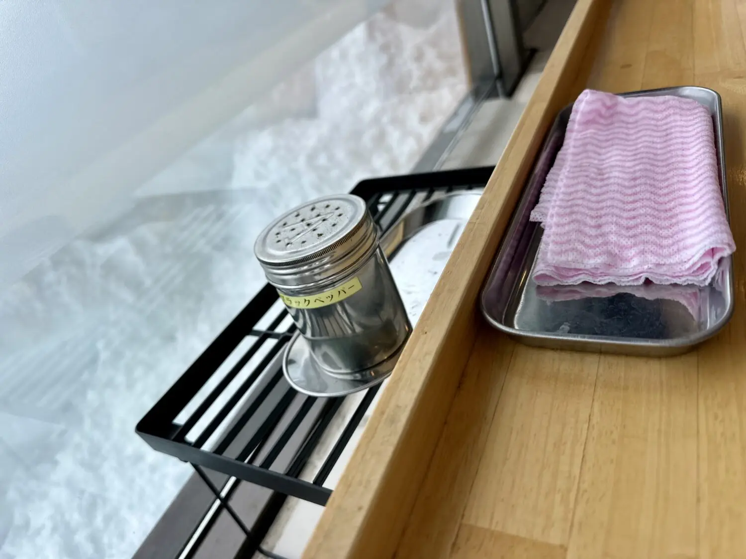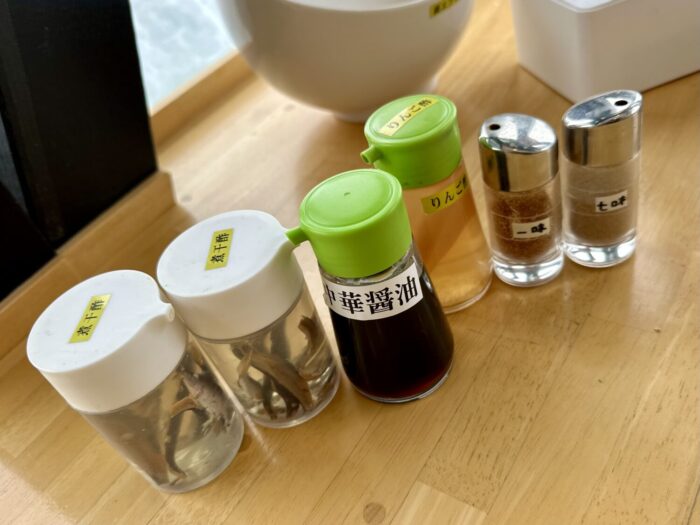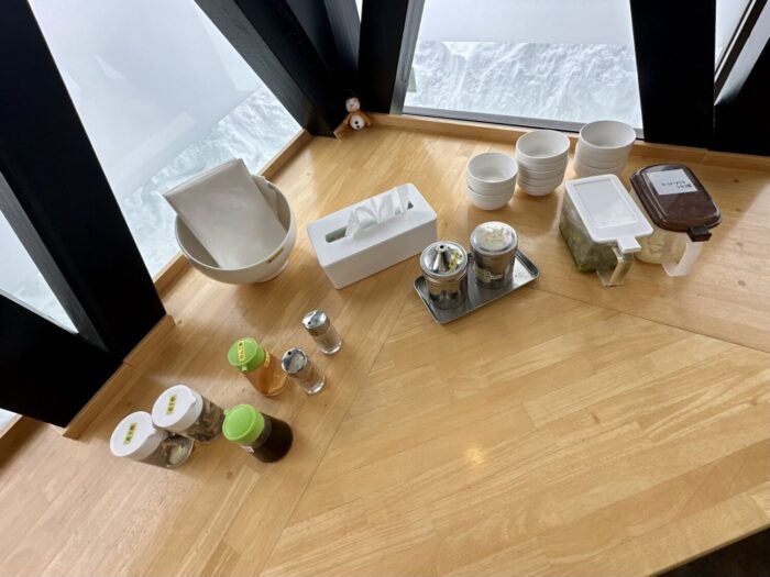 からのサービスコーナー配置の調味料も一枚パシャリ、おっふこんだけ揃ってれば調合次第で不老不死だべぇ、ってまたパシャリ