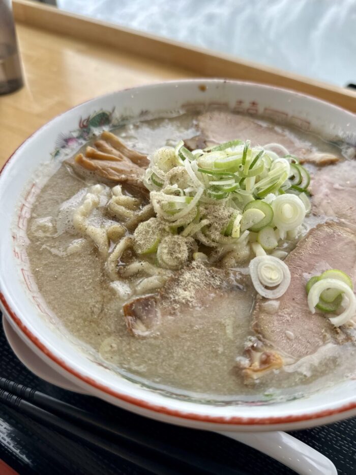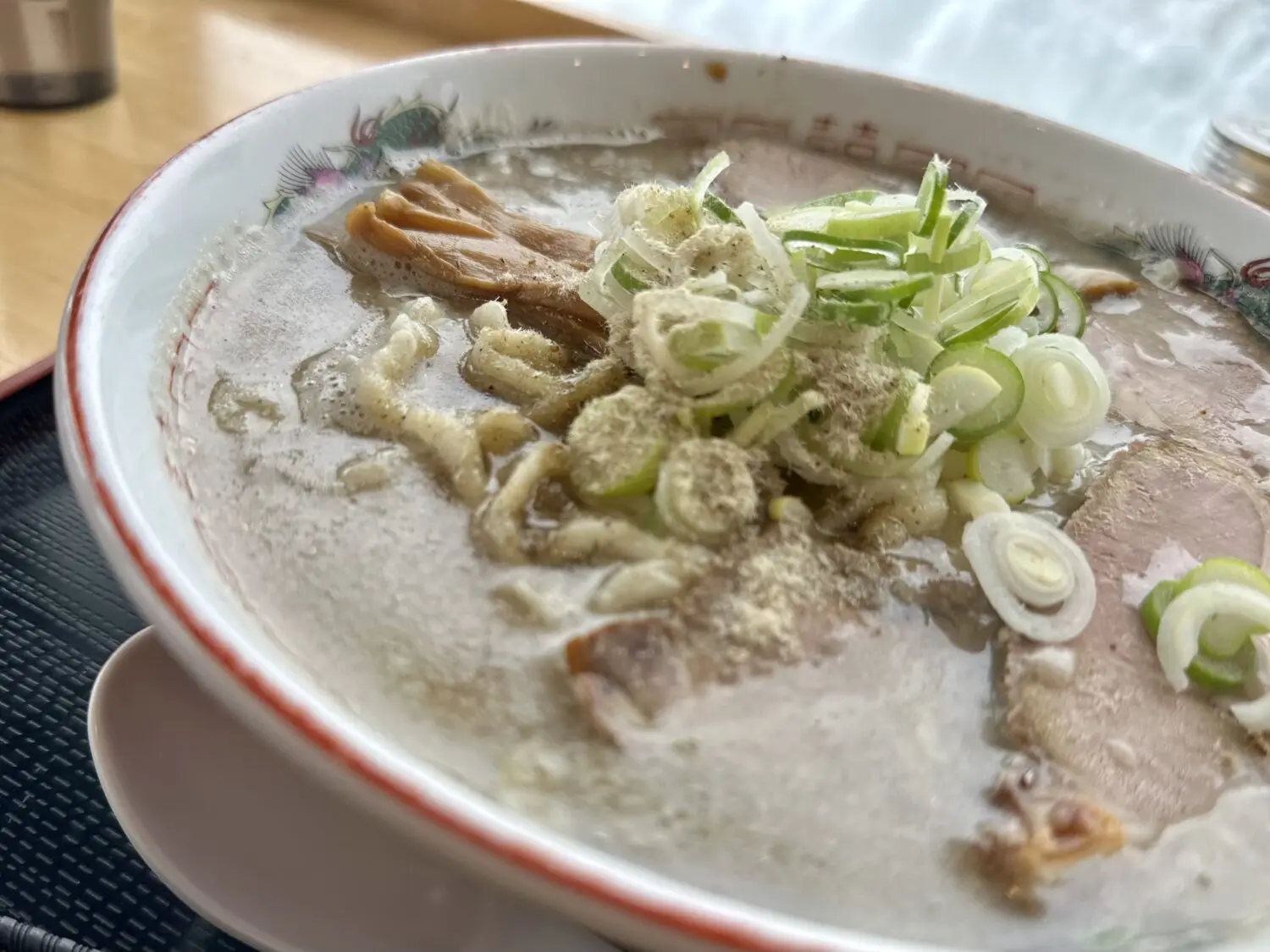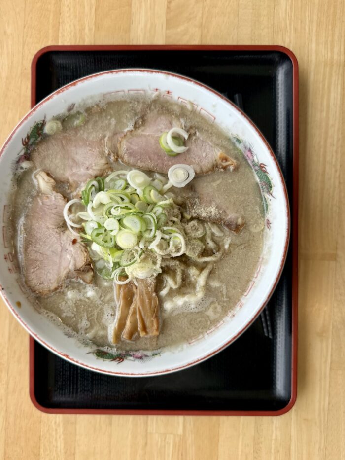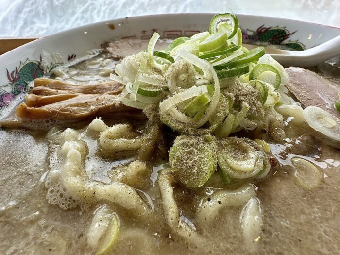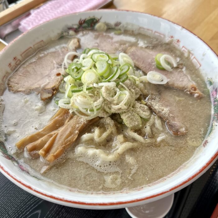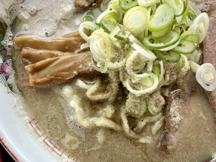 乗せ具はチャーシューいっぱいネギいっぱいにメンマもしっかり、仕上げの魚粉がまた頼もしく
