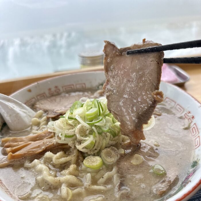 チャーシューはスープと相反しての脂身スクナメ、しっかりとした歯応えと噛み締めた時の肉の旨味らしさがたまらない
