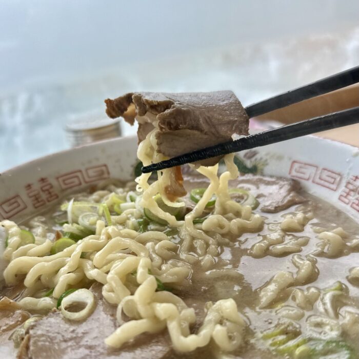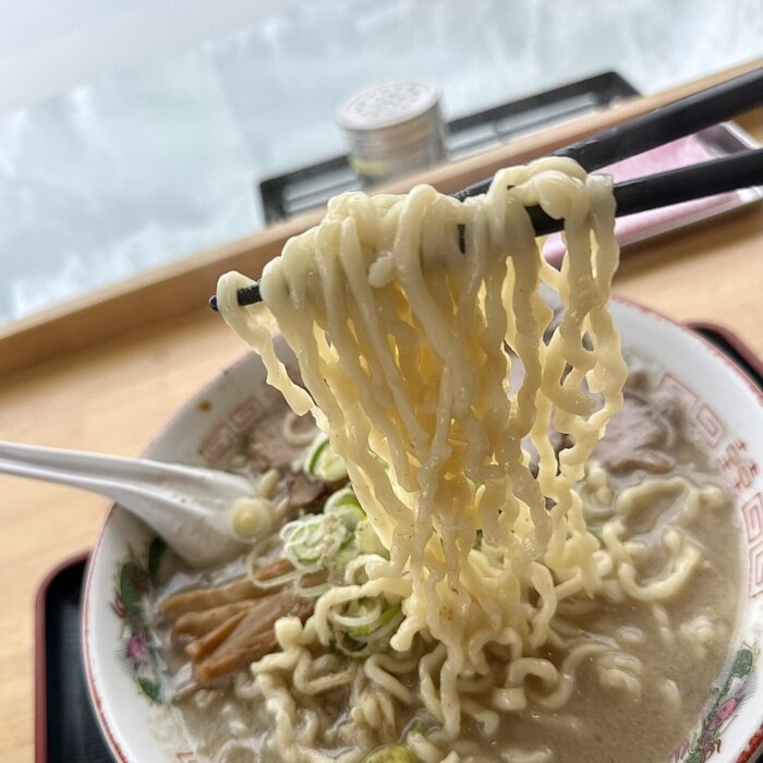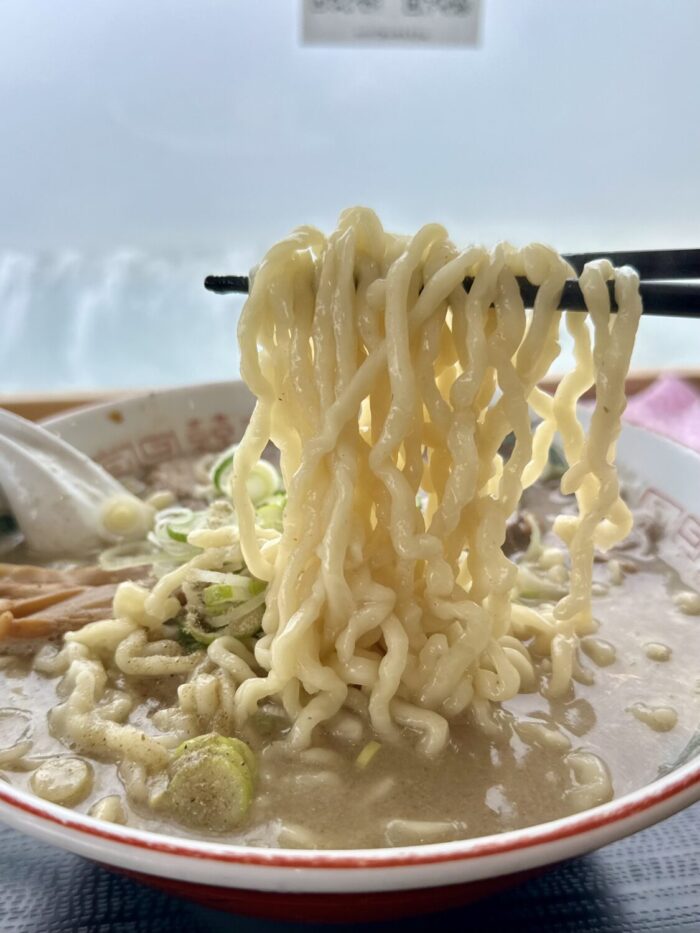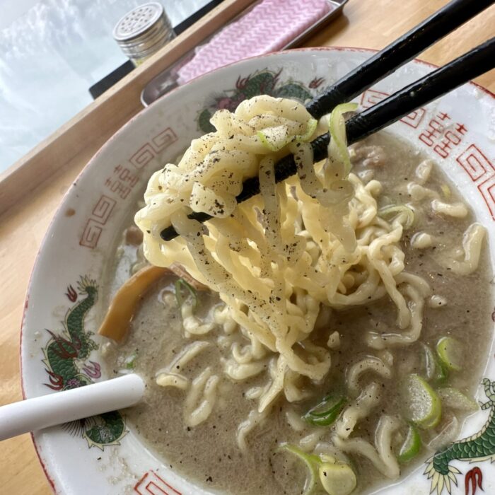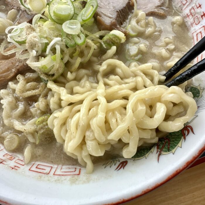 いわゆるヌルテカのゴンブトちぢれ麺、スープとの程よい距離感にネギとの相性も良く、大盛りでもサラッと食べきれちゃうスマートさも備え持つ。