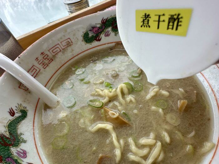 なかなかオイリーな油膜下に見えるのは、煮干しと豚骨出汁が描く混沌の世界