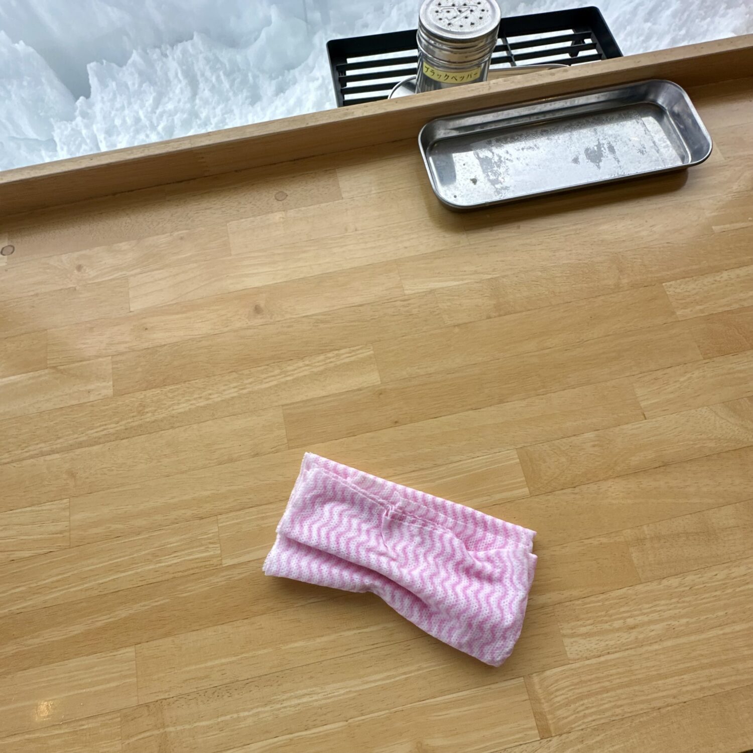 キレイに食べたらキレイキレイにお片付け、備え付けの布巾もって飛ばした汁跡もちゃんと最後までお片付け