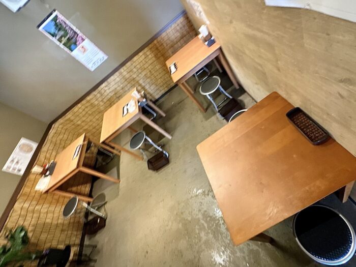カウンター席に2人掛けテーブルのみで構成される店内、MAXキャパとしたらひーふーみーよーいつむーえーっとえっと(;´Д`A