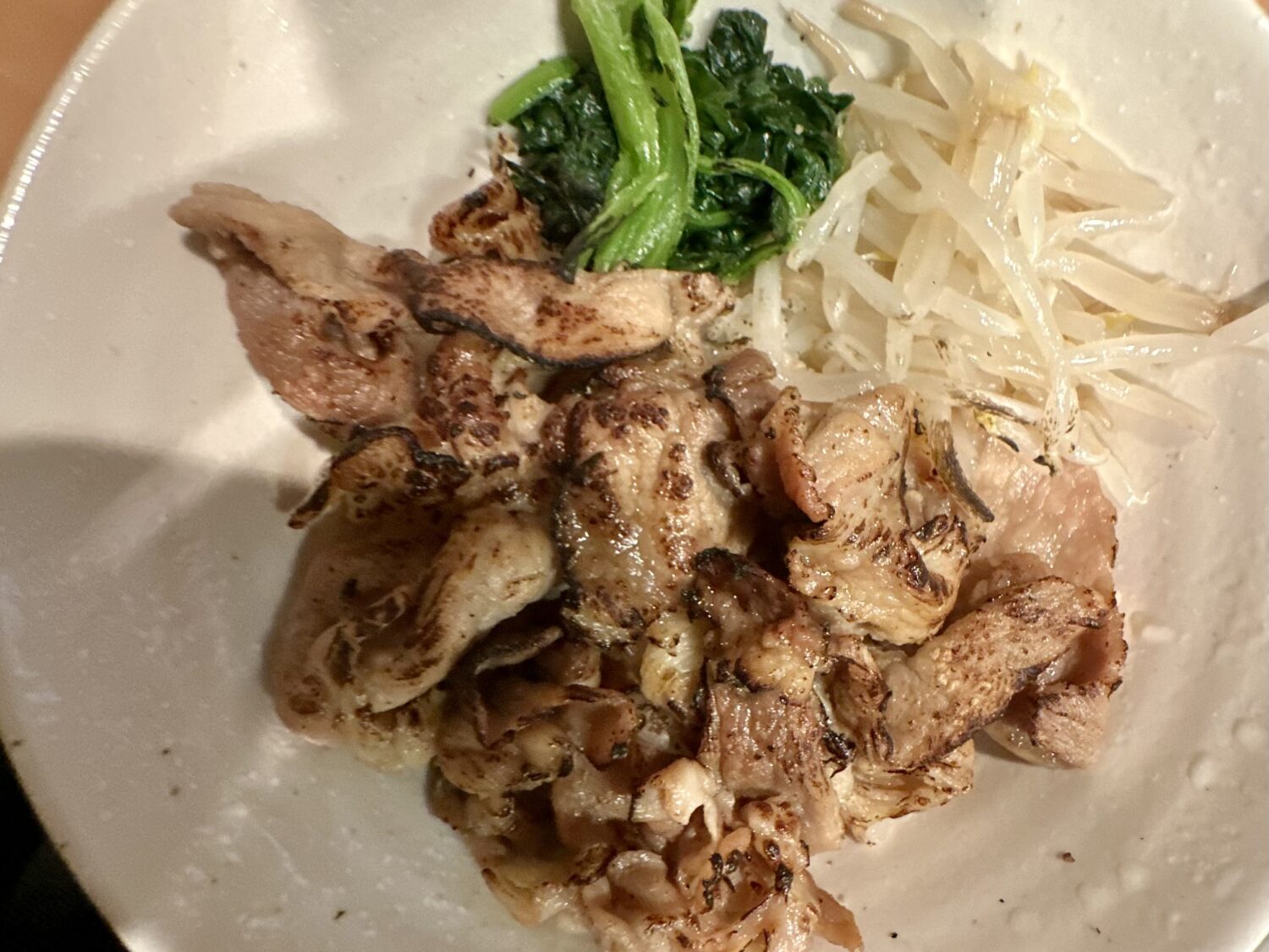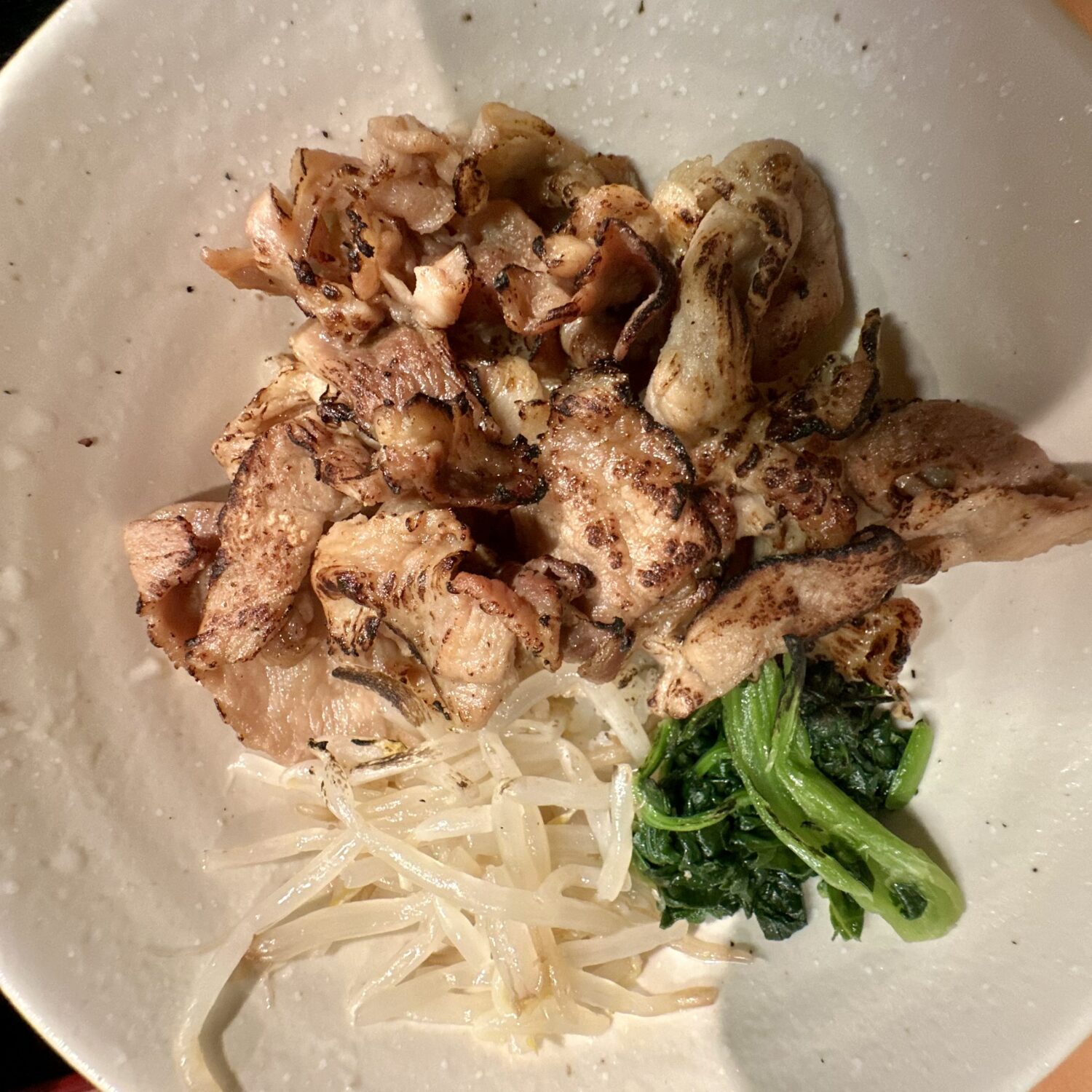 しっかり焼目のつけた豚バラ肉に、モヤシと葉っぱのナムルもセットでライスオン、それら咀嚼しながら次の麺をススリ喰う。