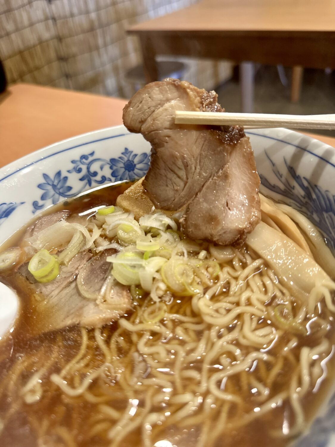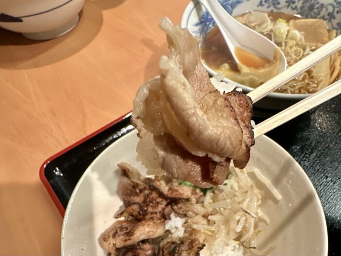 チャーシューは脂身少なめのしっかりタイプ、若干のハサハサマル度数のスリルもたまらない