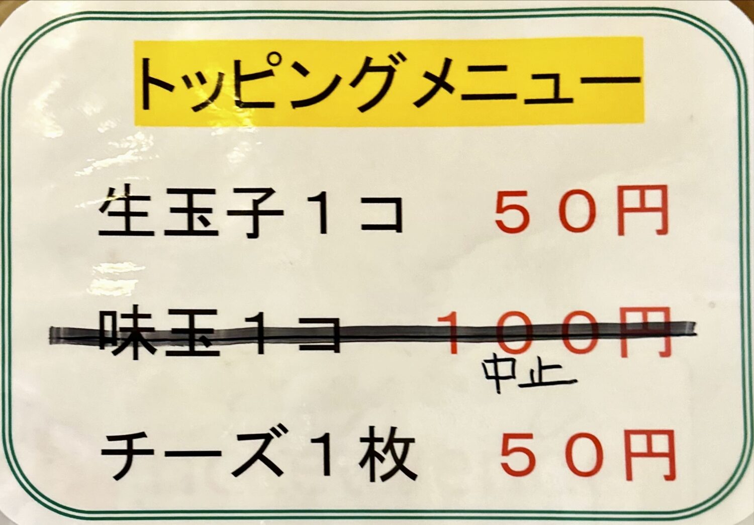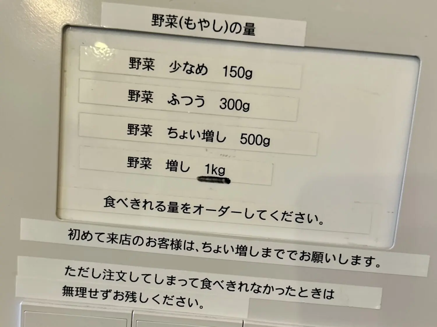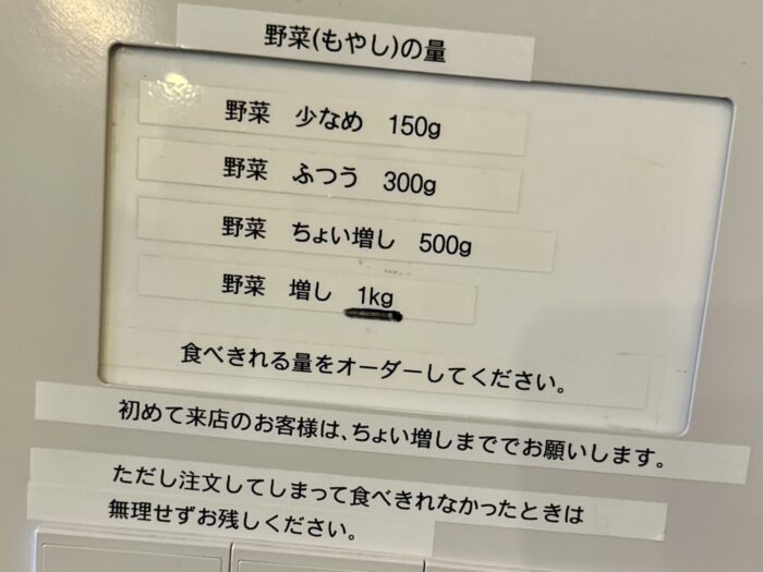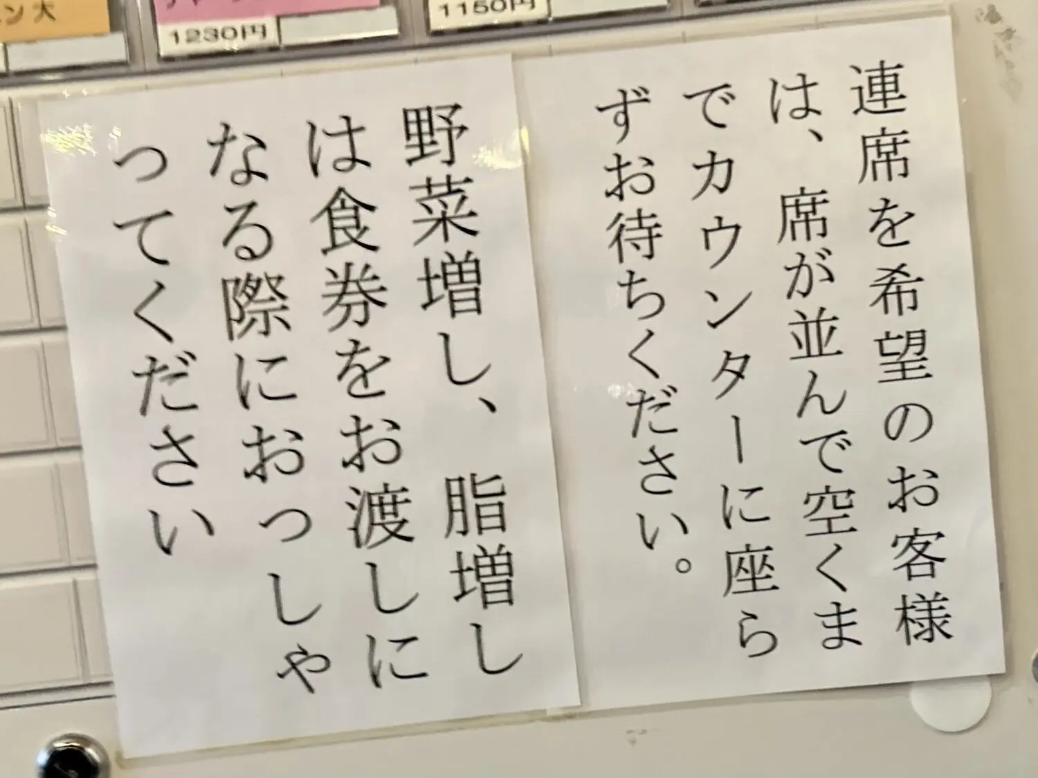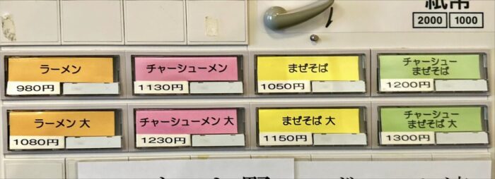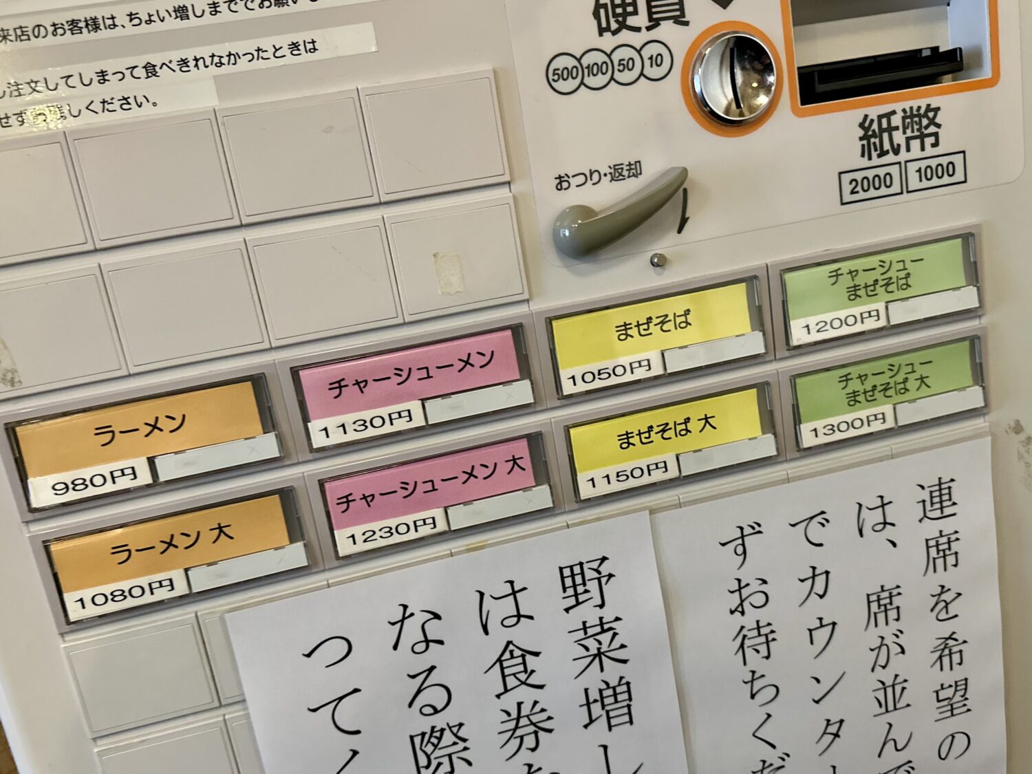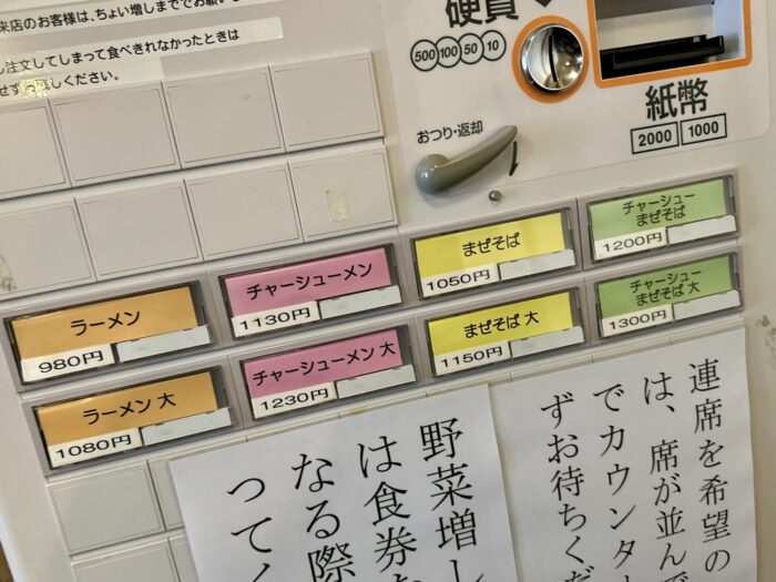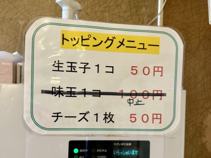 ガチャリと中入ったら券売機にご挨拶、トッピング類は現金注文になるから小銭ない人は用意してから向かいましょう