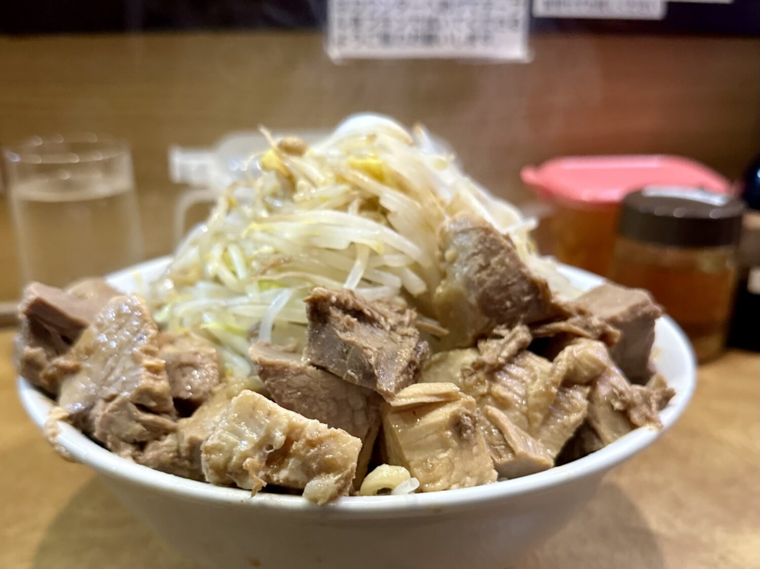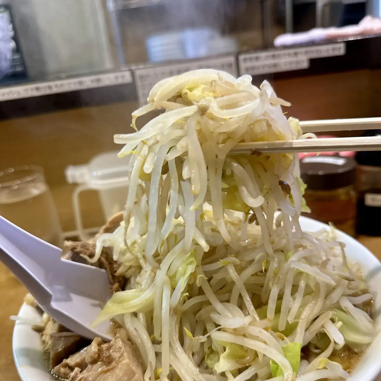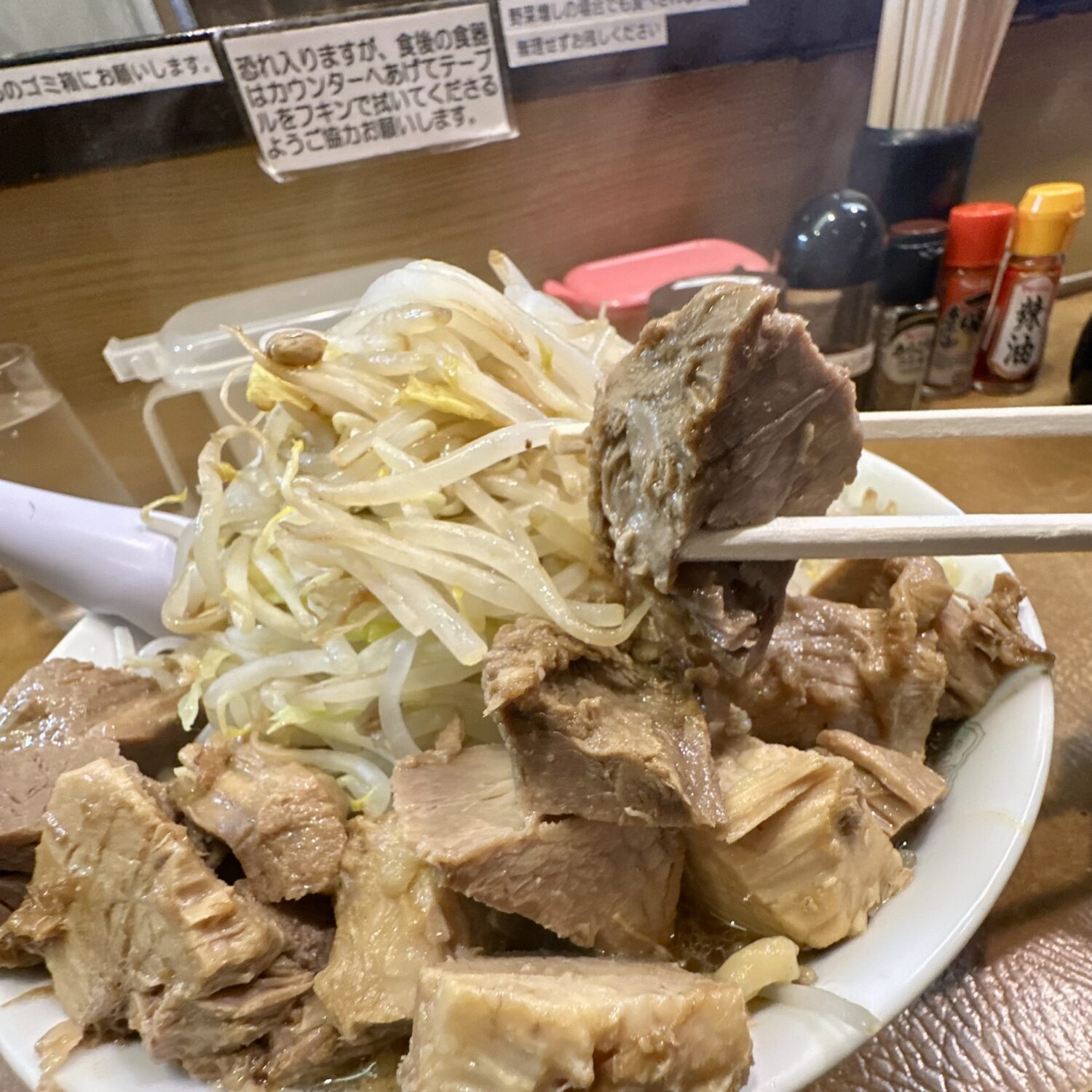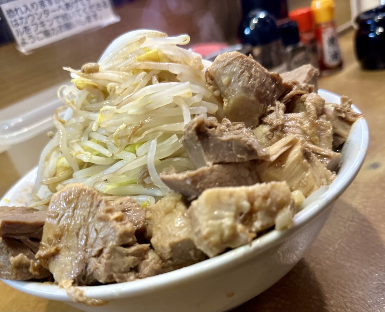 ここは世界中の二郎系見渡しても珍しい、なんと「ヤサイマシ頼んでも許される店」、だからってフザケ半分で頼んでいいことにはならないから要注意m9(☉౪