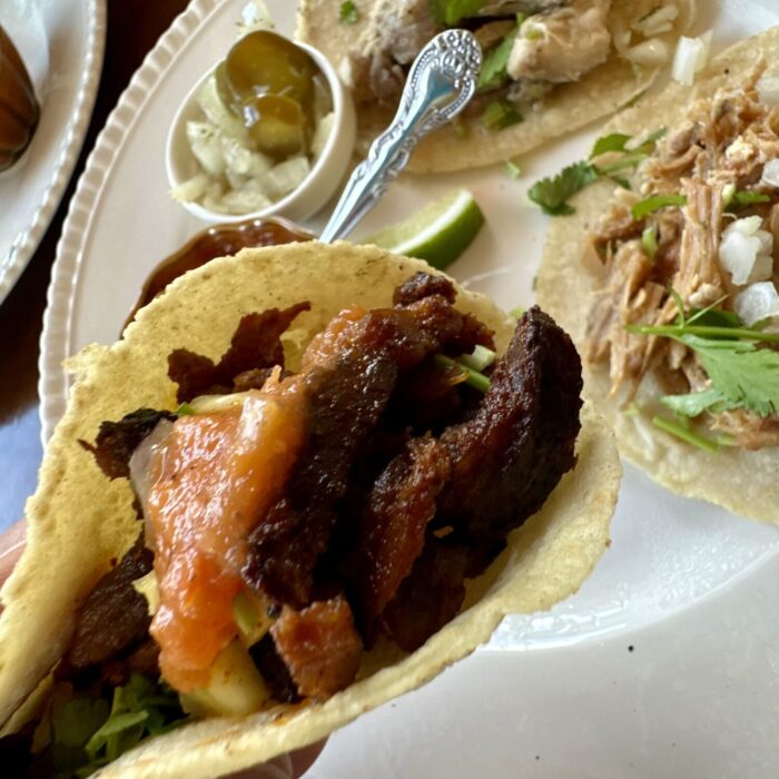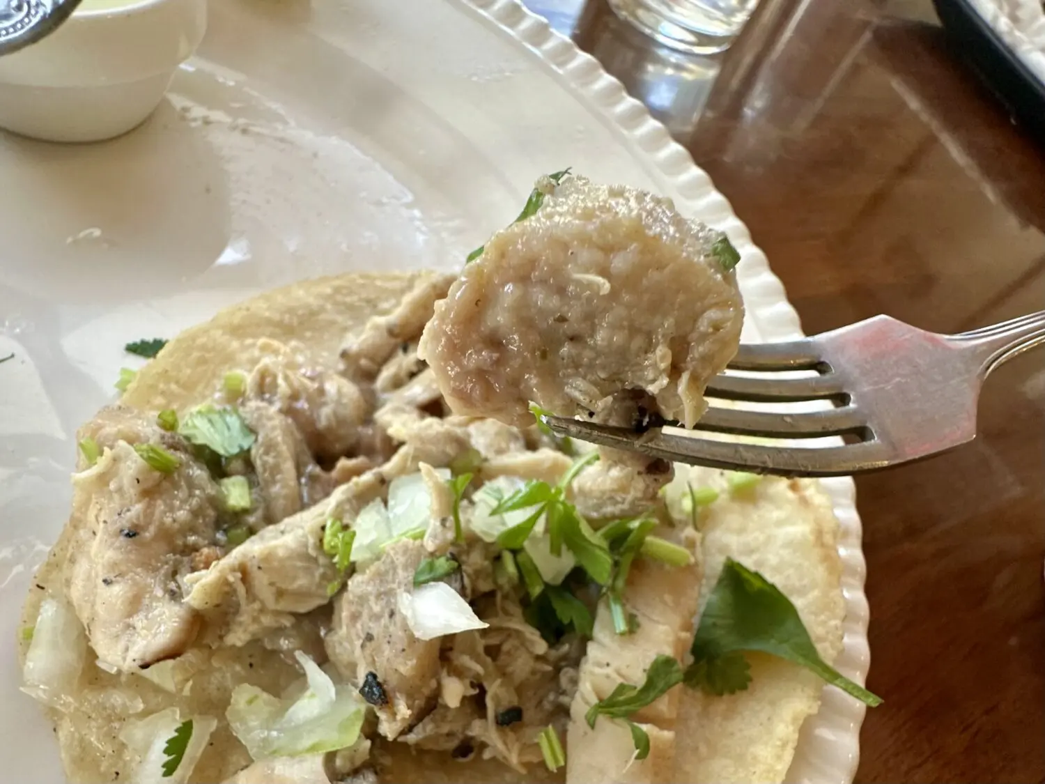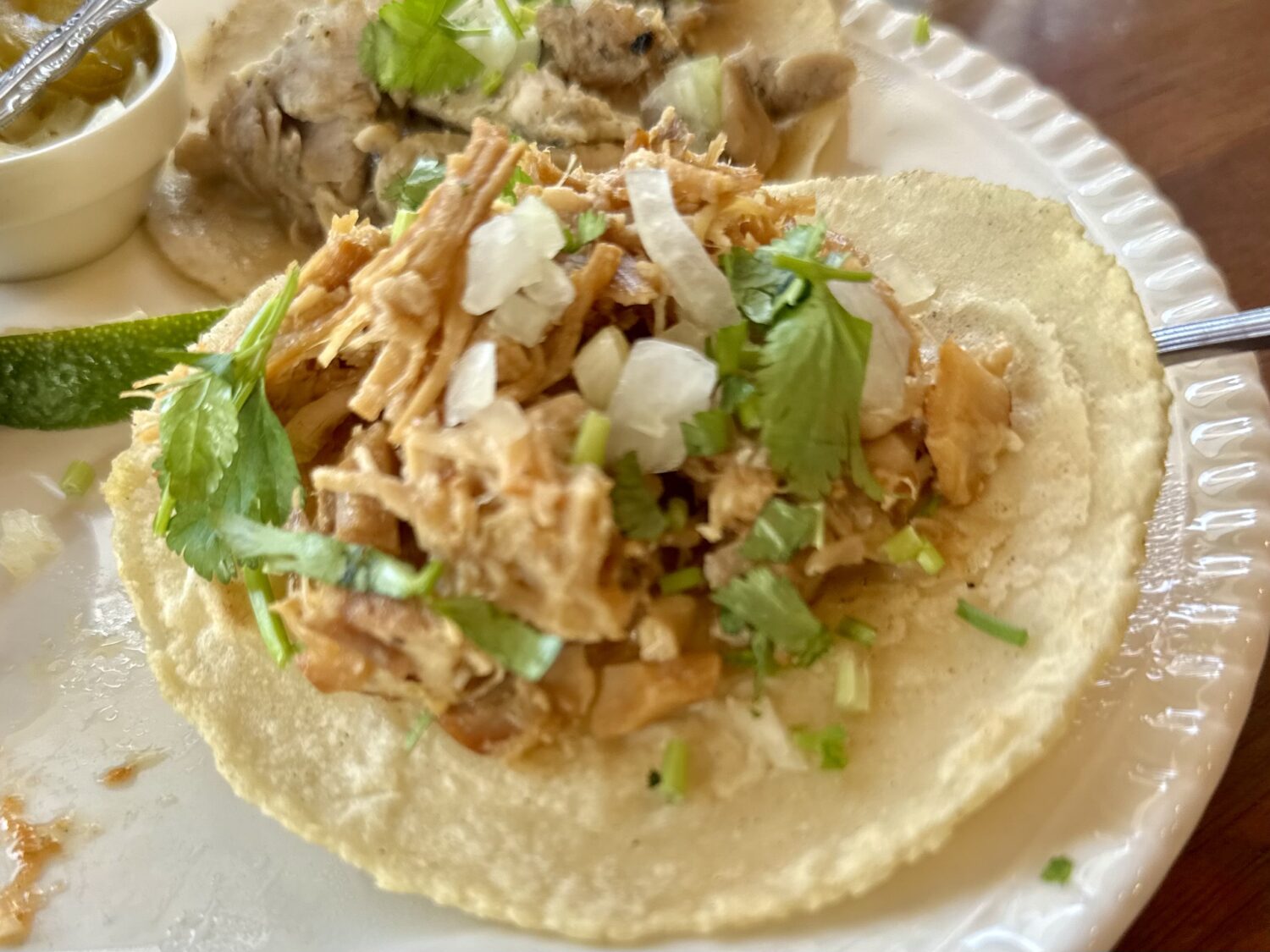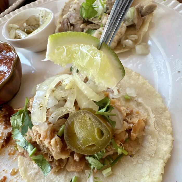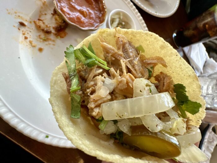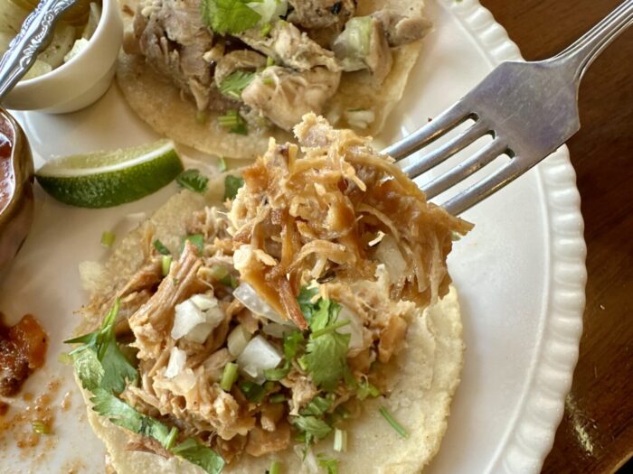 カルニータス:豚肉をホロホロになるまでオレンジでコンフィしたタコス