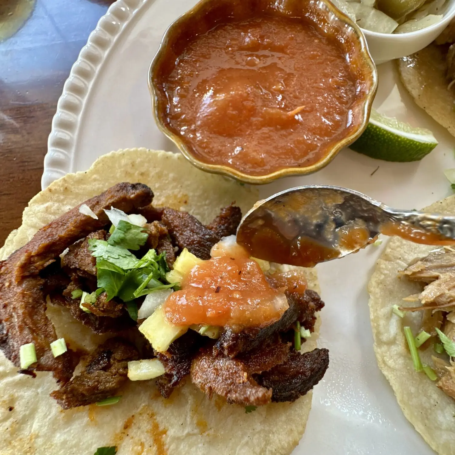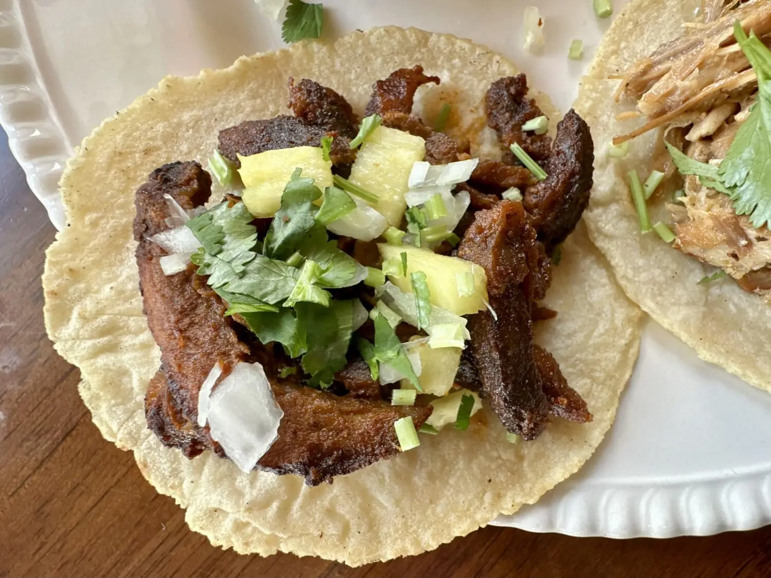 アルパストール:特製ダレに漬け込んだ豚肉をトロンポでじっくり焼き上げたタコス
