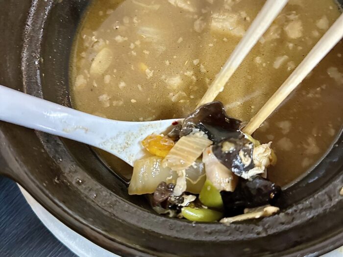 うどんライクな太麺にネギネギキクラゲ生卵、それらまとめて土鍋に入れたらグツラグツラと鬼ほど煮込む。